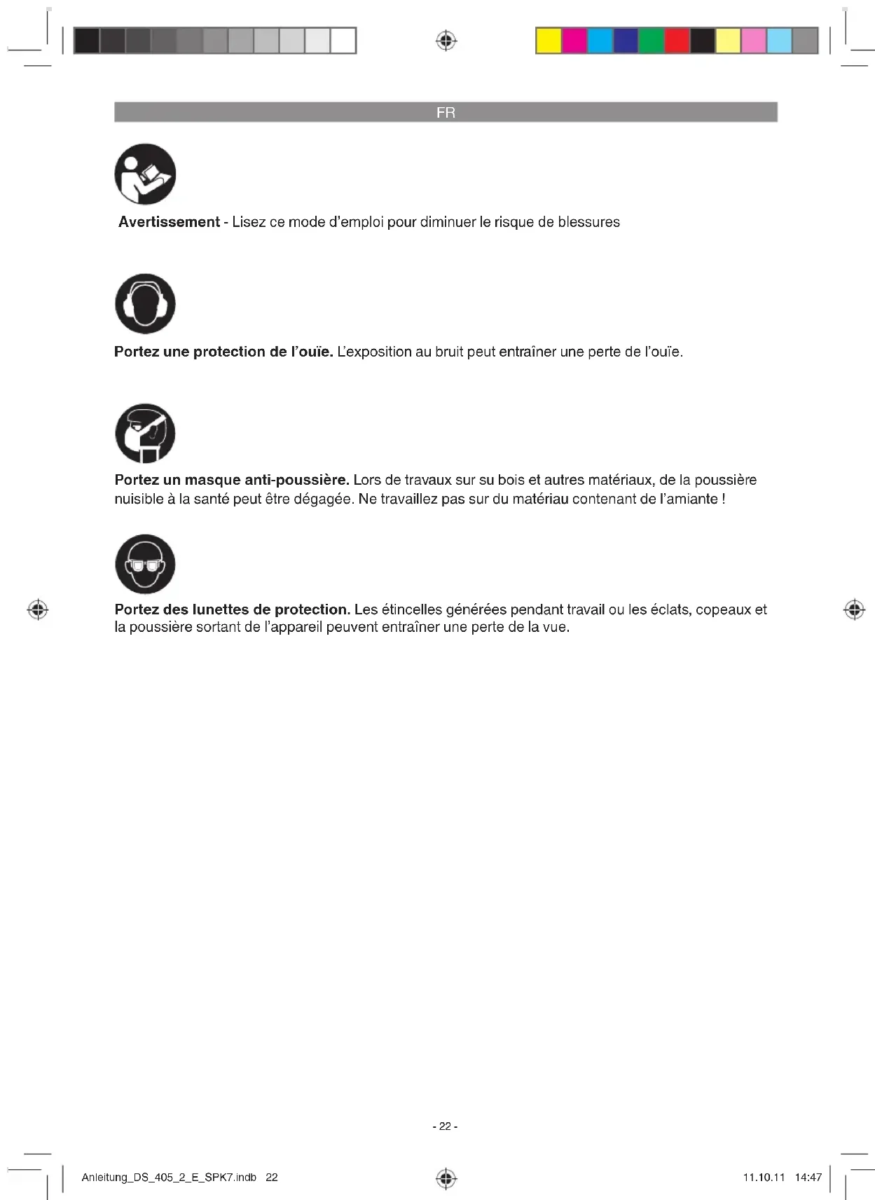 Avertissement - Lisez ce mode d’emploi pour diminuer le risque de blessures Portez une protection de l’ouïe. L’exposition au bruit peut entraîner une perte de l’ouïe. Portez des lunettes de protection. Les étincelles générées pendant travail ou les éclats, copeaux et la poussière sortant de l’appareil peuvent entraîner une perte de la vue. Portez un masque anti-poussière. Lors de travaux sur su bois et autres matériaux, de la poussière nuisible à la santé peut être dégagée. Ne travaillez pas sur du matériau contenant de l’amiante ! Anleitung_DS_405_2_E_SPK7.indb 22Anleitung_DS_405_2_E_SPK7.indb 22 11.10.11 14:4711.10.11 14:47FR