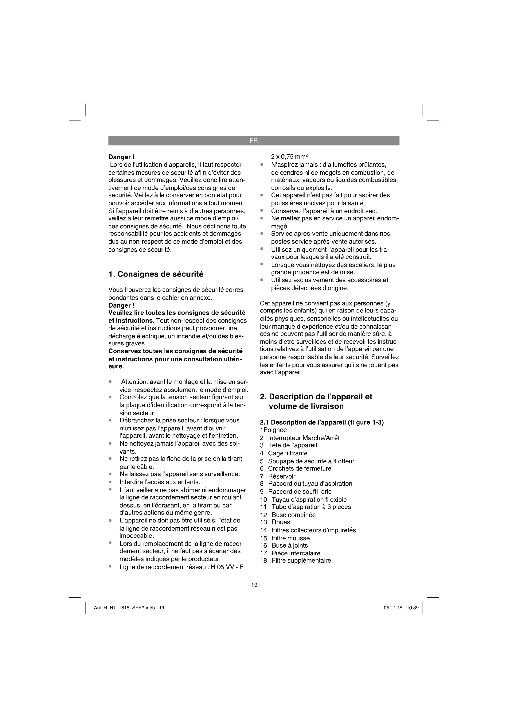 1 Poignée 2 Interrupteur Marche/Arrêt 3 Tête de l’appareil 4 Cage fi ltrante 5 Soupape de sécurité à fl otteur 6 Crochets de fermeture 7 Réservoir 8 Raccord du tuyau d’aspiration 9 Raccord de souffl erie 10 Tuyau d’aspiration fl exible 11 Tube d’aspiration à 3 pièces 12 Buse combinée 13 Roues 14 Filtres collecteurs d’impuretés 15 Filtre mousse 16 Buse à joints 17 Pièce intercalaire 18 Filtre supplémentaire Anl_H_NT_1815_SPK7.indb 19Anl_H_NT_1815_SPK7.indb 19 05.11.15 10:3905.11.15 10:39FR