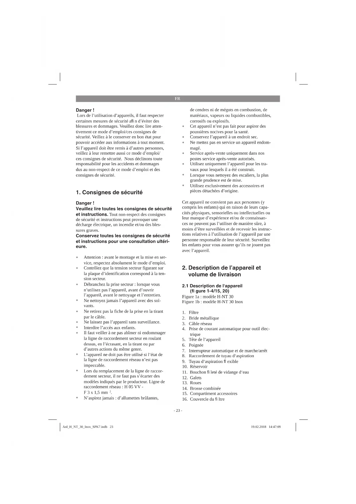 H-NT 30 Inox Tension du réseau : ............... 220-240 V ~ 50 Hz Puissance absorbée : ............................... 850 W Puissance absorbée max. prise de courant automatique : ............... 2600 W Puissance absorbée totale max. : ........... 3450 W Volume du réservoir : .................................... 30 l Poids : ................................................ env. 9,5 kg