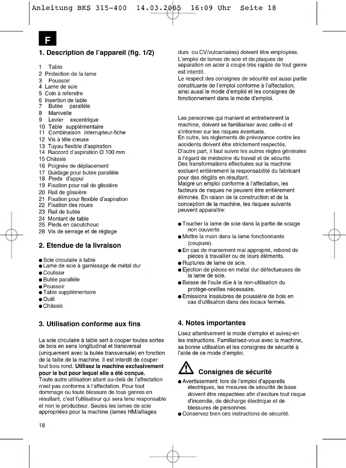 Anleitung BKS 315-400 14.03.2005 16:09 Uhr Seite 1920 Il faut absolument suivre les règlements de prévoyance contre les accidents en vigueur et les autres règles à l’égard de sécurité généralement reconnues. Conformez-vous aux fiches publiées par la caisse de prévoyance contre les accidents (VGB 7). Raccordez toujours le dispositif d’aspiration de poussière. N’employez la scie qu’avec un dispositif d’aspiration approprié ou avec un aspirateur industriel pour éviter des blessures causées par des éclats de sciage résidus éjectés. Respectez le sens de rotation du moteur et de la scie. Utilisez uniquement les lames dont la vitesse maximale autorisée est plus élevée que la vitesse maximale de broche de la scie circulaire à table et du matériau à découper. Utilisez uniquement les lames recommandées par le producteur, conformes à EN 847-1, avec un avertissement : lors du remplacement de la lame de scie, veillez à ce que la largeur de coupe ne soit pas plus petite et que l’épaisseur du tronc de la lame de scie ne soit pas plus grande que celle du coin à refendre. Le capot de protection amovible (2) ne doit pas être fixé en position ouverte. Utilisez et réglez correctement le dispositif de protection supérieur de la lame de scie. Remplacez la plaque d’insertion usée. Utilisez absolument un poussoir (3) pour couper des pièces minces (largeur ne dépassant pas 120 mm). Le poussoir ou la poignée pour un bois poussoir doit toujours être conservé sur la machine lorsqu’il n’est pas utilisé. Raccordez le dispositif d’aspiration de la poussière pour chaque activité. En sciant du bois, il faut raccorder les scies circulaires à un dispositif d’aspiration de la poussière. L’opérateur doit être informé sur les conditions qui influencent la libération de poussière par ex. le type de matériau à travailler (détermination et source), l’importance de la séparation locale et du réglage correct des hottes/chicanes/ guidages. Si nécessaire, portez les équipements de protection personnels adéquats. Ceux-ci peuvent englober : - une protection de l’ouïe pour éviter le risque de devenir sourd ; - une protection de la respiration pour réduire le risque de respirer de la poussière dangereuse. - portez des gants lorsque vous manipulez les lames de scie et des matériaux rêches. Il faut toujours que les lames soient portées dans un récipient dès que cela est possible. L’opérateur doit être informé sur les conditions qui favorisent la formation du bruit (par ex. les lames de scie qui ont été construites pour réduire la formation du bruit, l’entretien de la lame et de la machine). Les dérangements au niveau de la machine, y compris des dispositifs de protection et de la lame de scie, doivent être signalés à la personne responsable dès qu’ils ont été découverts. Lors du transport de la machine, utilisez uniquement les dispositifs de transport et n’utilisez jamais les dispositifs de protection pour la manutention et le transport. Pendant le transport, l’élément supérieur de la lame de scie doit être couvert, par exemple avec le dispositif de protection. N’effectuez pas d’agrafage ou de rainurage, sans avoir mis un dispositif de protection adéquat, comme par ex. un dispositif en tunnel, sur la table de sciage. Les scies circulaires ne doivent pas être utilisées pour fendre (rainure terminée dans la pièce à usiner) ! Attention Risque de blessure ! Ne mettez pas vos doigts dans la lame en service