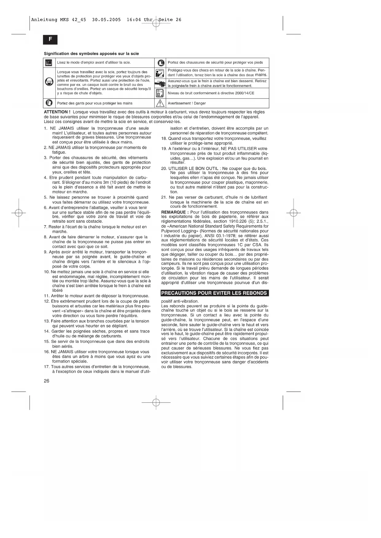 Lisez le mode d’emploi avant d’utiliser la scie. Lorsque vous travaillez avec la scie, portez toujours des lunettes de protection pour protéger vos yeux d’objets pro- jetés et virevoltants. Portez aussi une protection de l’ouïe, comme par ex. un casque isolé contre le bruit ou des bouchons d’oreilles. Portez un casque de sécurité lorsqu’il y a risque de chute d’objets. Protégez-vous des chocs en retour de la scie à chaîne. Pen- dant l’utilisation, tenez bien la scie à chaîne des deux mains. Portez des gants pour vous protéger les mains Portez des chaussures de sécurité pour protéger vos pieds Niveau de bruit conformément à directive 2000/14/CE Avertissement ! Danger Assurez-vous que le frein à chaîne est bien desserré. Retirez la poignée/le frein à chaîne avant le fonctionnement. Anleitung MKS 42_45 30.05.2005 16:04 Uhr Seite 26F