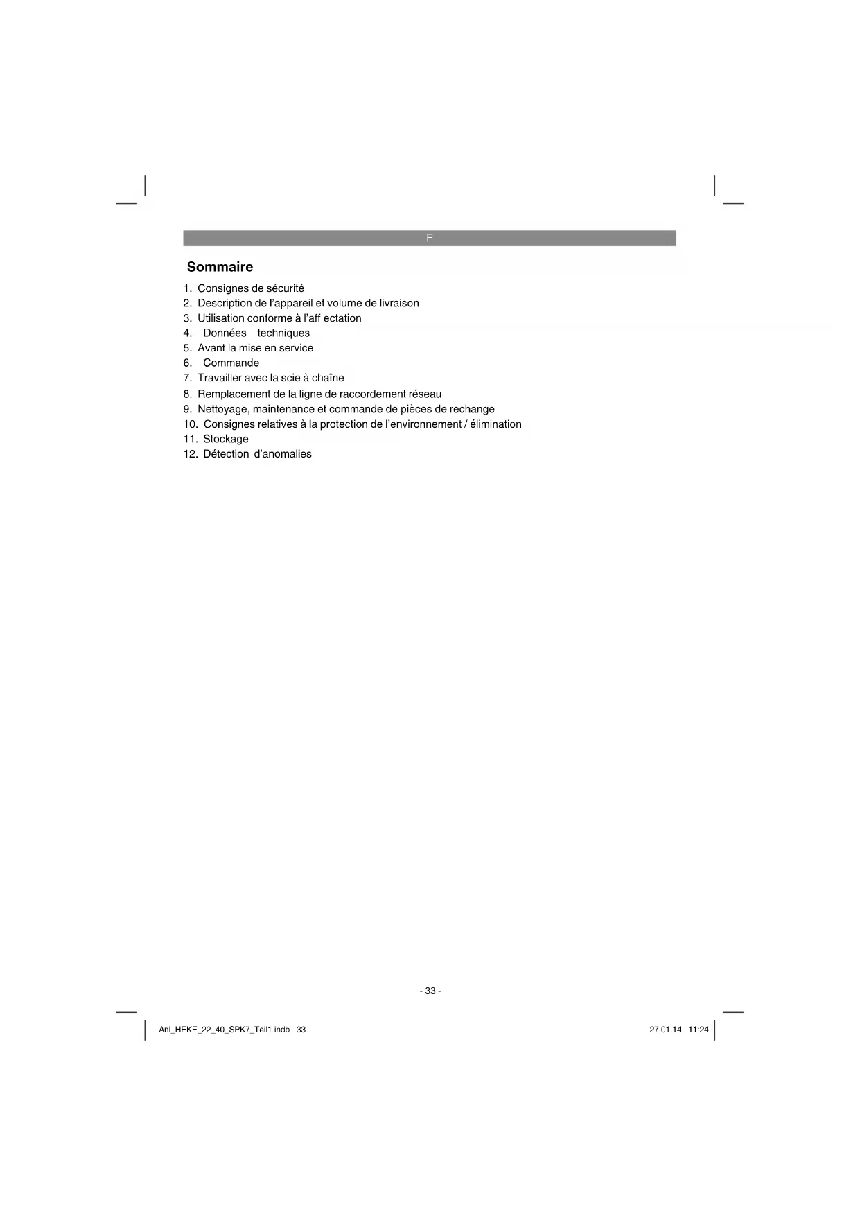 Avant toute utilisation, vérifi ez les points suivants afi n de travailler en toute sécurité : Etat de la scie à chaîne Avant de commencer à travailler, contrôlez la scie à chaîne et vérifi ez que le boîtier, le câble réseau, la chaîne de scie et la lame ne sont pas endom- magés. Ne mettez jamais en marche un appareil de toute évidence endommagé. Anl_HEKE_22_40_SPK7_Teil1.indb 37Anl_HEKE_22_40_SPK7_Teil1.indb 37 27.01.14 11:2427.01.14 11:24F