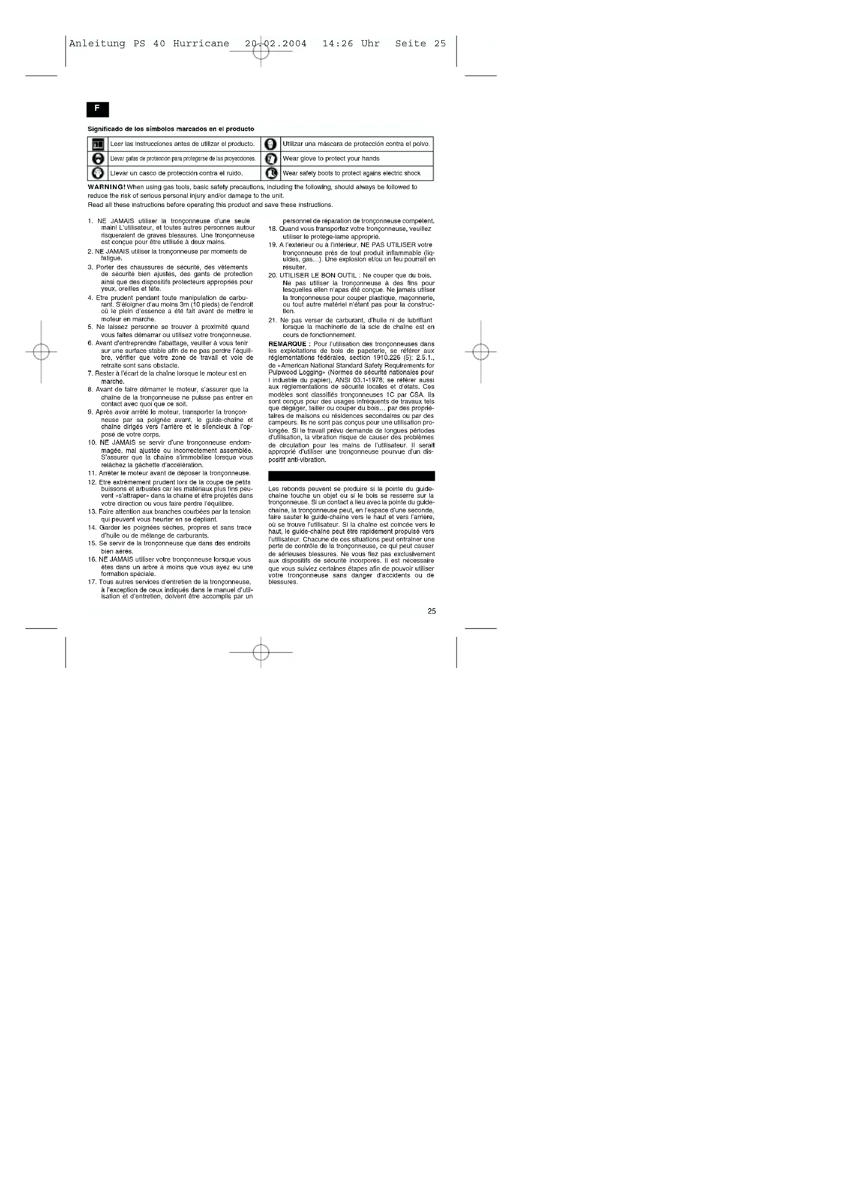 lorsque la machinerie de la scie de chaîne est en cours de fonctionnement. REMARQUE : Pour l’utilisation des tronçonneuses dans les exploitations de bois de papeterie, se référer aux réglementations fédérales, section 1910.226 (5); 2.5.1., de «American National Standard Safety Requirements for Pulpwood Logging» (Normes de sécurité nationales pour l industrie du papier), ANSI 03.1-1978; se référer aussi aux réglementations de sécurité locales et d’états. Ces modèles sont classifiés tronçonneuses 1C par CSA. Ils sont conçus pour des usages infréquents de travaux tels que dégager, tailler ou couper du bois… par des proprié- taires de maisons ou résidences secondaires ou par des campeurs. Ils ne sont pas conçus pour une utilisation pro- longée. Si le travail prévu demande de longues périodes d’utilisation, la vibration risque de causer des problèmes de circulation pour les mains de l’utilisateur. Il serait approprié d’utiliser une tronçonneuse pourvue d’un dis- positif anti-vibration. Les rebonds peuvent se produire si la pointe du guide- chaîne touche un objet ou si le bois se resserre sur la tronçonneuse. Si un contact a lieu avec la pointe du guide- chaîne, la tronçonneuse peut, en l’espace d’une seconde, faire sauter le guide-chaîne vers le haut et vers l’arrière, où se trouve l’utilisateur. Si la chaîne est coincée vers le haut, le guide-chaîne peut être rapidement propulsé vers l’utilisateur. Chacune de ces situations peut entrainer une perte de contrôle de la tronçonneuse, ce qui peut causer de sérieuses blessures. Ne vous fiez pas exclusivement aux dispositifs de sécurité incorporés. Il est nécessaire que vous suiviez certaines étapes afin de pouvoir utiliser votre tronçonneuse sans danger d’accidents ou de blessures. Significado de los símbolos marcados en el producto Leer las instrucciones antes de utilizar el producto. Llevar gafas de protección para protegerse de las proyecciones. Llevar un casco de protección contra el ruido. Utilizar una máscara de protección contra el polvo. Wear glove to protect your hands Wear safety boots to protect agains electric shock