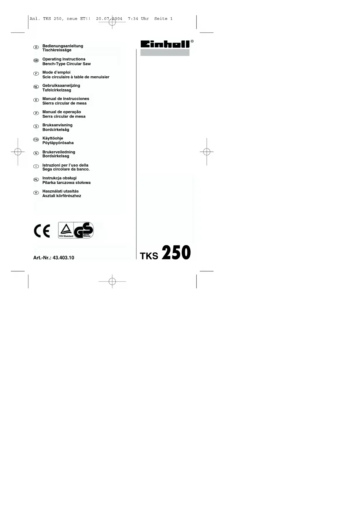 Retrouvez gratuitement la notice de l'appareil TKS 250 EINHELL au format PDF.