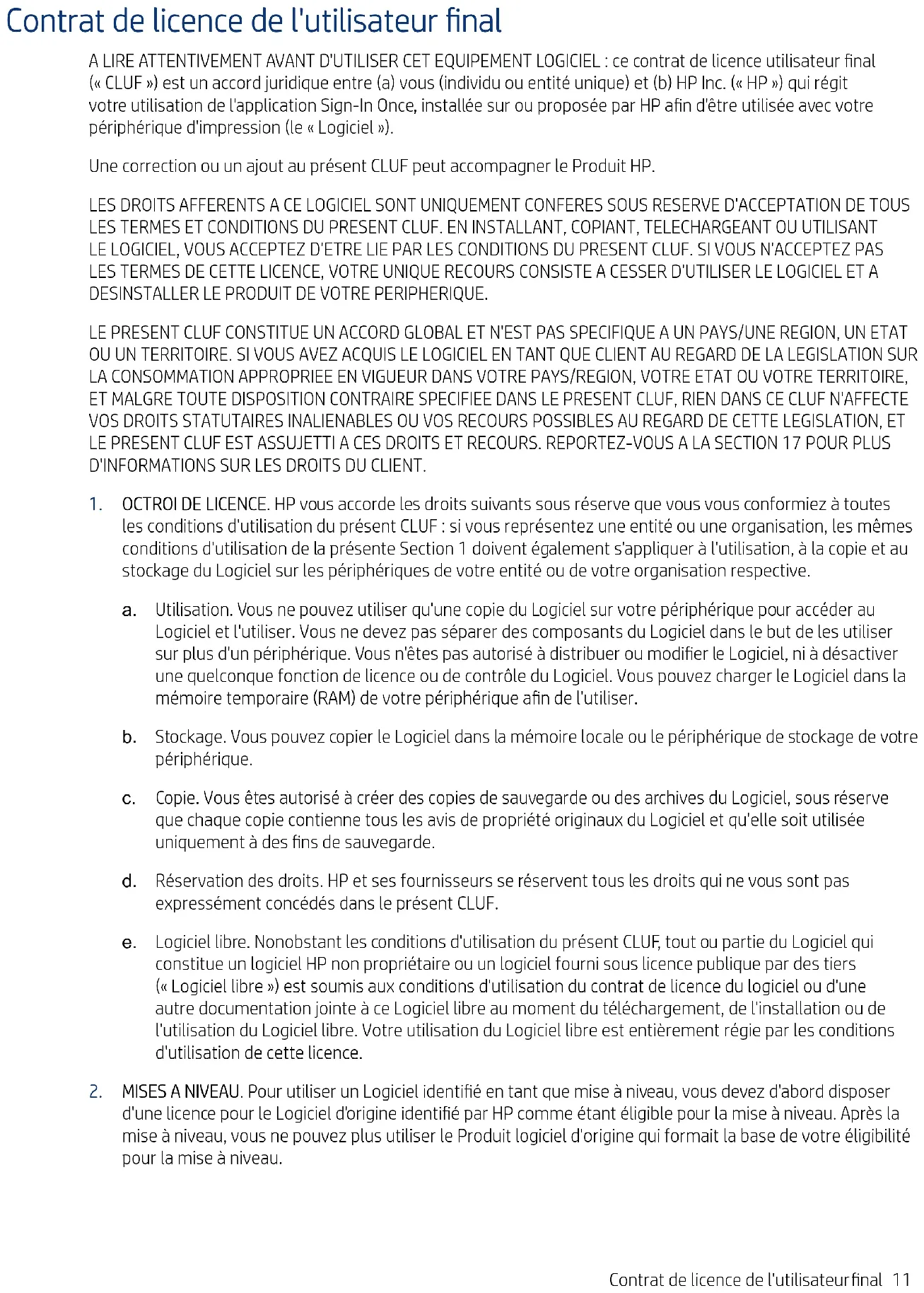 A LIRE ATTENTIVEMENT AVANT D'UTILISER CET EQUIPEMENT LOGICIEL : ce contrat de licence utilisateur nal (« CLUF ») est un accord juridique entre (a) vous (individu ou entité unique) et (b) HP Inc. (« HP ») qui régit votre utilisation de l'application Sign-In Once, installée sur ou proposée par HP an d'être utilisée avec votre périphérique d'impression (le « Logiciel »). Une correction ou un ajout au présent CLUF peut accompagner le Produit HP. LES DROITS AFFERENTS A CE LOGICIEL SONT UNIQUEMENT CONFERES SOUS RESERVE D'ACCEPTATION DE TOUS LES TERMES ET CONDITIONS DU PRESENT CLUF. EN INSTALLANT, COPIANT, TELECHARGEANT OU UTILISANT LE LOGICIEL, VOUS ACCEPTEZ D'ETRE LIE PAR LES CONDITIONS DU PRESENT CLUF. SI VOUS N'ACCEPTEZ PAS LES TERMES DE CETTE LICENCE, VOTRE UNIQUE RECOURS CONSISTE A CESSER D'UTILISER LE LOGICIEL ET A DESINSTALLER LE PRODUIT DE VOTRE PERIPHERIQUE. LE PRESENT CLUF CONSTITUE UN ACCORD GLOBAL ET N'EST PAS SPECIFIQUE A UN PAYS/UNE REGION, UN ETAT OU UN TERRITOIRE. SI VOUS AVEZ ACQUIS LE LOGICIEL EN TANT QUE CLIENT AU REGARD DE LA LEGISLATION SUR LA CONSOMMATION APPROPRIEE EN VIGUEUR DANS VOTRE PAYS/REGION, VOTRE ETAT OU VOTRE TERRITOIRE, ET MALGRE TOUTE DISPOSITION CONTRAIRE SPECIFIEE DANS LE PRESENT CLUF, RIEN DANS CE CLUF N'AFFECTE VOS DROITS STATUTAIRES INALIENABLES OU VOS RECOURS POSSIBLES AU REGARD DE CETTE LEGISLATION, ET LE PRESENT CLUF EST ASSUJETTI A CES DROITS ET RECOURS. REPORTEZ-VOUS A LA SECTION 17 POUR PLUS D'INFORMATIONS SUR LES DROITS DU CLIENT.