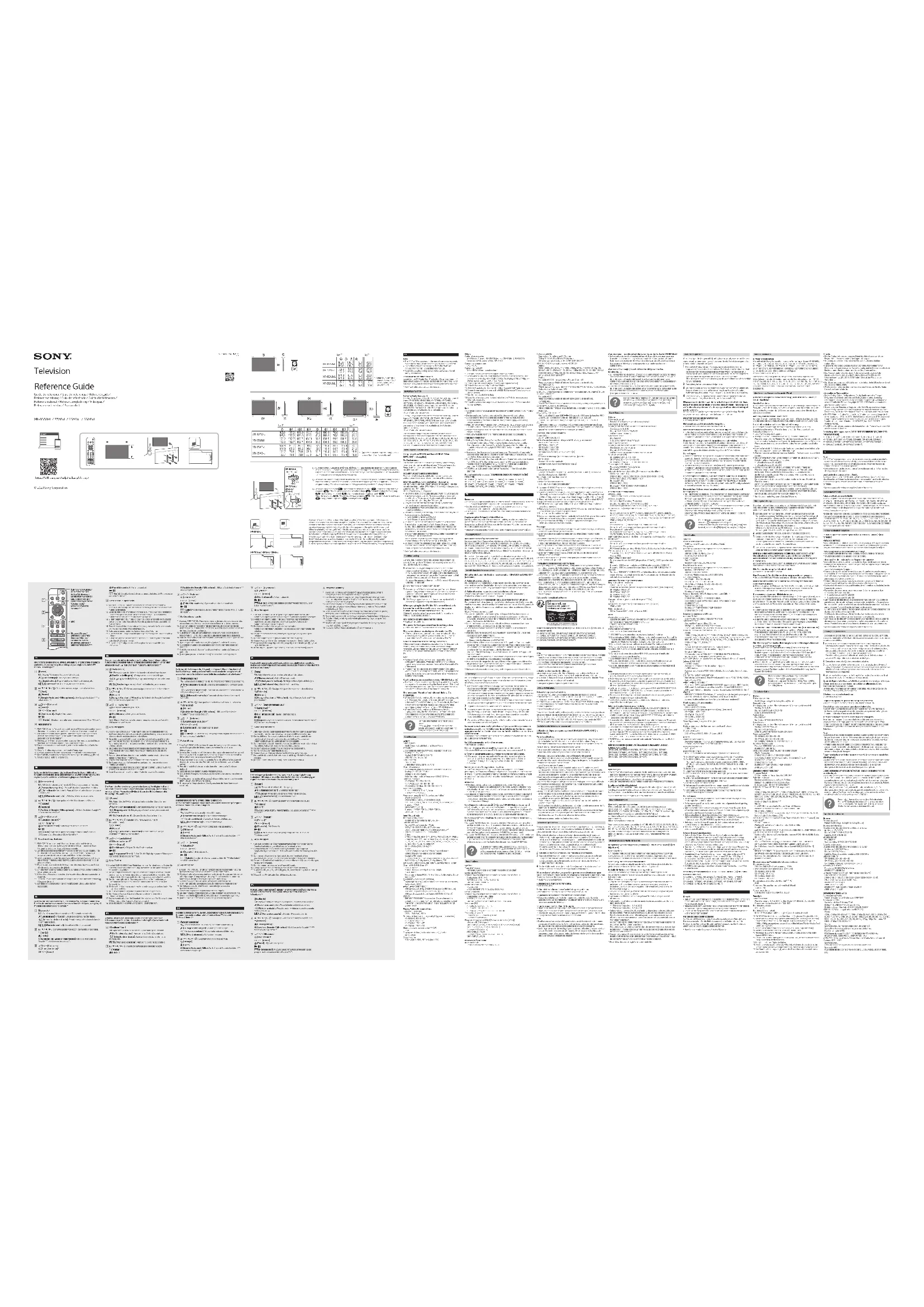 - Le « x »/« xx » qui apparaît dans le nom de modèle correspond à un chiffre qui désigne la présentation, la couleur ou la norme de télévision.•Les instructions relatives à l’ « Installation du téléviseur au mur » sont incluses dans le mode d’emploi du téléviseur.•Lisez la documentation de sécurité fournie pour plus d’informations de sécurité. Emplacement de l’étiquette d’identification Les étiquettes reprenant le numéro de modèle, la date de production (année/mois)* et les caractéristiques nominales de l’alimentation se trouvent à l’arrière du téléviseur ou de l’emballage. Vous les trouverez en retirant le cache des bornes.* Uniquement pour certaines régions, certains pays ou certains modèles. AVIS IMPORTANT Avis concernant les équipements radio Le soussigné, Sony Corporation, déclare que les équipements radioélectriques de type XR-83A84L, XR-83A80L, XR-77A84L, XR-77A83L, XR-77A80L, XR-65A84L, XR-65A83L, XR-65A80L, XR-55A84L, XR-55A83L, XR-55A80L sont conformes à la directive 2014/53/UE. Le texte complet de la déclaration UE de conformité est disponible à l’adresse internet suivante :https://compliance.sony.euPour cet équipement radio, les restrictions de mise en service ou de demandes d’autorisation d’utilisation suivantes s’appliquent en AT, BE, HR, CY, CZ, DK, EE, FI, FR, DE, EL, HU, IE, IT, LV, LT, LU, MT, NL, PL, PT, SK, SI, ES, SE, UK, UK (NI), IS, LI, NO, CH, BG, RO, TR, AL, BA, MK, MD, RS, ME, Kosovo : La bande 5150 - 5350 MHz est limitée aux utilisations en intérieur uniquement. Installation du téléviseur au mur Utilisation du Support de fixation murale en option (SU-WL850 ou SU-WL450)* (non fourni) A l’attention des clients: Pour protéger le produit et pour des raisons de sécurité, Sony conseille vivement de confier l’installation de votre téléviseur à des revendeurs ou des installateurs agréés Sony. N’essayez pas de l’installer vous-même. A l’attention des revendeurs et installateurs Sony: Soyez particulièrement attentif à la sécurité pendant l’installation, l’entretien périodique et l’examen du produit. Informations sur l’installation du Support de fixation murale Pour obtenir les instructions de l’installation du Support de fixation murale, veuillez vous reporter à la section Informations sur l’installation (Support de fixation murale) sur la page du produit correspondant à votre modèle de téléviseur. https://www.sony.eu/support•Suivez le mode d’emploi fourni avec le Support de fixation murale de votre modèle. Une certaine expérience est requise pour installer ce téléviseur, en particulier pour déterminer la résistance du mur qui devra supporter le poids du téléviseur.•Sony n’est responsable d’aucun dégât ou blessure provoqué par une erreur de manipulation ou installation incorrecte.•L’installation murale du téléviseur doit être confiée à un technicien spécialisé.•Pour des raisons de sécurité, il est vivement recommandé d’utiliser les accessoires Sony, notamment :— Support de fixation murale SU-WL850— Support de fixation murale SU-WL450•Veillez à bien utiliser les vis fournies avec le Support de fixation murale lors de la mise en place du Support de fixation murale sur le téléviseur. Les vis fournies sont conçues de la manière illustrée, mesurées à partir de la surface de fixation du Support de fixation murale. Leur diamètre et leur longueur varient suivant le modèle de Support de fixation murale. L’utilisation de vis autres que celles fournies peut occasionner des dégâts à l’intérieur du téléviseur ou provoquer sa chute, etc.•Assurez-vous de ranger les vis non utilisées et le support de table en lieu sûr jusqu’à ce que vous soyez prêt à fixer le support de table. Conservez les vis hors de portée des jeunes enfants.* Uniquement pour certaines régions, certains pays ou certains modèles. Dépannage Pour les dépannages généraux tels que : écran noir, absence de son, image figée, téléviseur ne réagissant plus pas de réaction du téléviseur ou perte de réseau, suivez les étapes ci-après. 1 Redémarrez votre téléviseur en appuyant sur la touche de mise en marche de la télécommande pendant environ cinqsecondes. Le téléviseur redémarre. Si le téléviseur n’est pas remis en état, essayez de débrancher le cordon d’alimentation secteur, puis appuyez sur le touche de mise en marche du téléviseur et relâchez-la. Attendez deux minutes et branchez le cordon d’alimentation secteur. Ou appuyez sur la touche de mise en marche sur le téléviseur pendant environ 40secondes jusqu’à ce que le téléviseur se mette hors tension. 2 Reportez-vous au menu Aide illustré ci-dessous. 3 Raccordez votre téléviseur à Internet et effectuez une mise à jour du logiciel. Sony vous recommande de mettre à jour le logiciel de votre téléviseur régulièrement. Les mises à jour fournissent de nouvelles fonctionnalités et améliorent les performances. 4 Visitez le site Web d’assistance Sony (informations fournies à la fin de la documentation de sécurité jointe). Lorsque vous branchez le téléviseur, il est possible que vous ne puissiez pas allumer le téléviseur immédiatement même si vous appuyez sur la touche de mise en marche de la télécommande ou du téléviseur. L’initialisation du système prend du temps. Attendez environ une minute, puis utilisez-le normalement. La télécommande ne fonctionne pas.