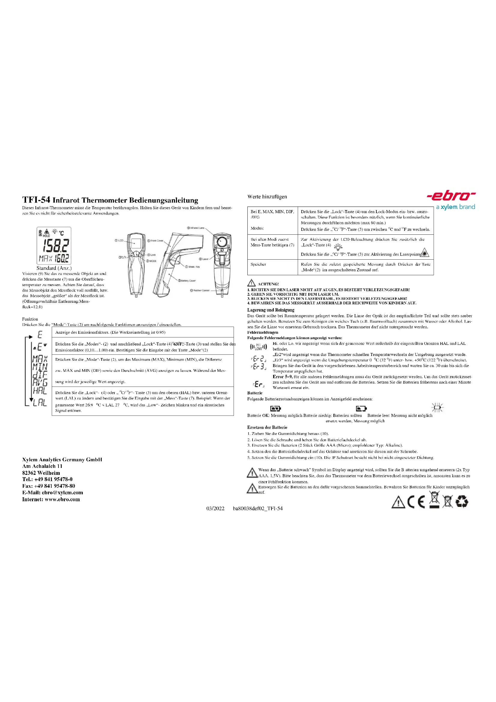 perating Range 0~50°C (32~122°F) Accuracy, (Tobj=15-35°C,Tamb=25°C) +/-1.5°C (2.7°F) Accuracy (Tamb=23 +/- 3°C) Tobj=0~550°C:+/-2% of reading or 2°C (4°F) whichever is greater Tobj=-60~0 oC: +/-(2°C+0.05/degree C) Emissivity 0.95 default – adjustable 0.1 to 1 step .01 Resolution (-9.9~199.9°C) 0.1°C/0.1°F otherwise 1°C/1°F Response Time (90%) 1sec Distance:Spot 12:1 Battery Life Typ.18, min 14 hours continuous use Dimensions 143.90*116.73*42.78 mm(5.67×4.60×1.68 inch) Weight 180 grams(6.35 oz) including batteries (AAA*2pcs) Note: Under the electromagnetic field of 3V/m from 200 to 700 MHz, the maximum error is 5 oC (9 oF). The thermometer will automatically shut off if left idle for more than 15 sec. Xylem Analytics Germany GmbH Am Achalaich 11 82362 Weilheim Tel.: +49 841 95478-0 Fax: +49 841 95478-80 E-Mail: ebro@xylem.com Internet: www.ebro.com03/2022 ba80038def02_TFI-54 Thermomètre TFI-54 Mode d’emploi Thermomètre à infrarouge sans contact avec touche modedonnant accès à différentes fonctionnalités. Veillez à garder l‟appareil hors de la portée des enfants et ne pas utiliser dans le cadre d‟applications directement liées à la sûreté. Dirigez le thermomètre la lentille (9) en direction de la cible à mesurer et appuyez sur la touche de mesure (7) afin d’afficher la température de surface. La relation distance à la cible est de 12:1. Veuillez vous assurer que la zone ciblée se trouve dans le champ visé. TOUCHE MODE: Appuyez sur la touche mode (2) afin de faire défiler la liste des fonctionnalités indiquées ci-dessous. Ici s‟affiche le degré d‟émissivité. (L‟émissivité par défaut est 0.95.) Appuyez sur la touche Mode (2) , puis appuyez sur la touche de verrouillage (4) ou sur la touche oC/ oF (3) pour régler l’émissivité, puis appuyez sur la touche Mode (2) pour confirmer. L‟émissivité est réglable de 0.10 à 1.00. Appuyez sur la touche Mode (2) pour accéder aux modes Maximum (MAX), Minimum (MIN), différence entre MAX et MIN (DIF) et la moyenne (AVG). Pendant la mesure, les modes de lectures sélectionnés seront affichés à côté de l‟icône Mode. Appuyez sur la touche de verrouillage (4) ou sur la touche oC/ oF (3) pour modifier l’alarme haute (HAL) ou l’alarme basse (LAL), puis appuyez sur la touche de mesure (7) pour confirmer. L‟icône d‟alarme basse ou haute clignotera et vous entendrez u n bip sonore. Autres fonctions PRECAUTIONS