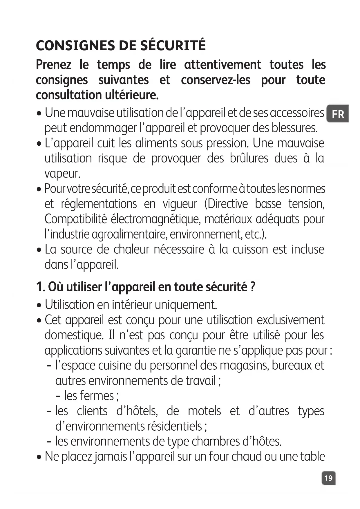- L’appareil cuit les aliments sous pression. Une mauvaise utilisation risque de provoquer des brûlures dues à la vapeur.