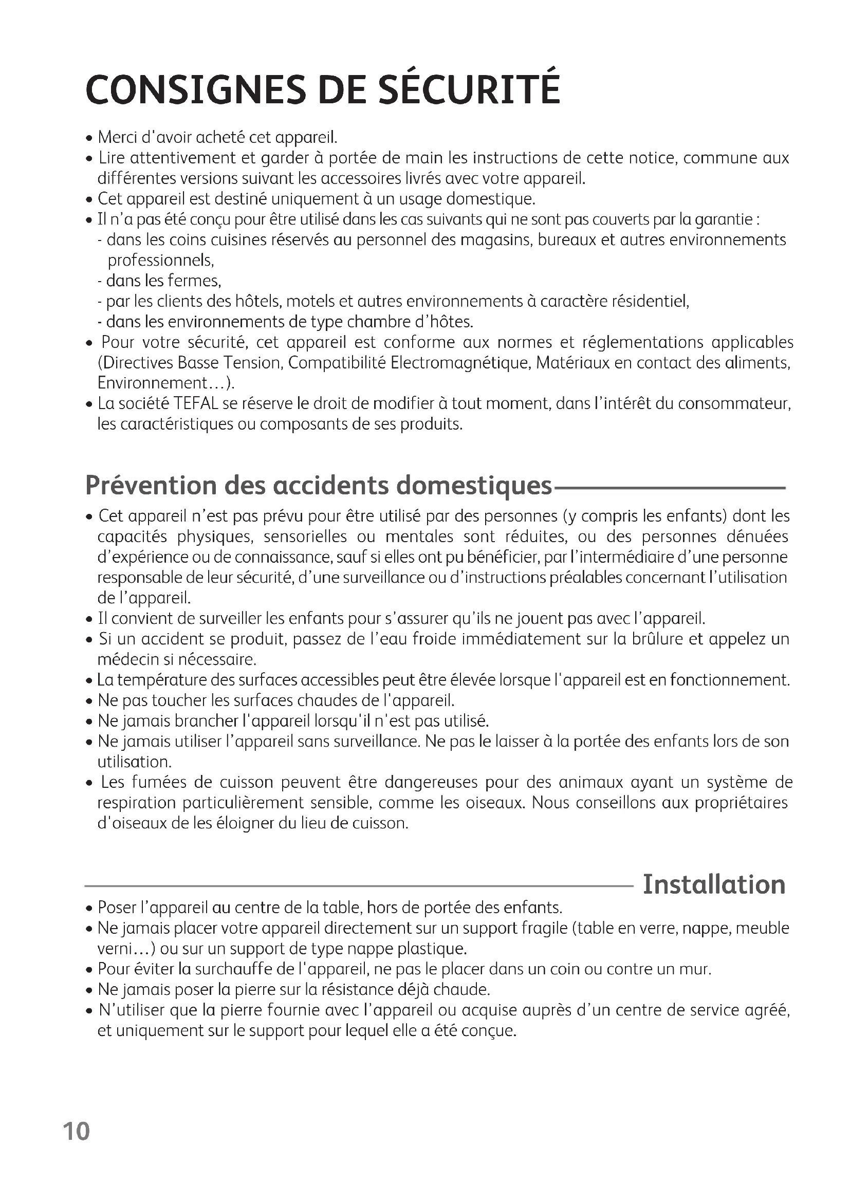 - La société TEFAL se réserve le droit de modifier à tout moment, dans l’intérêt du consommateur, les caractéristiques ou composants de ses produits. Prévention des accidents domestiques