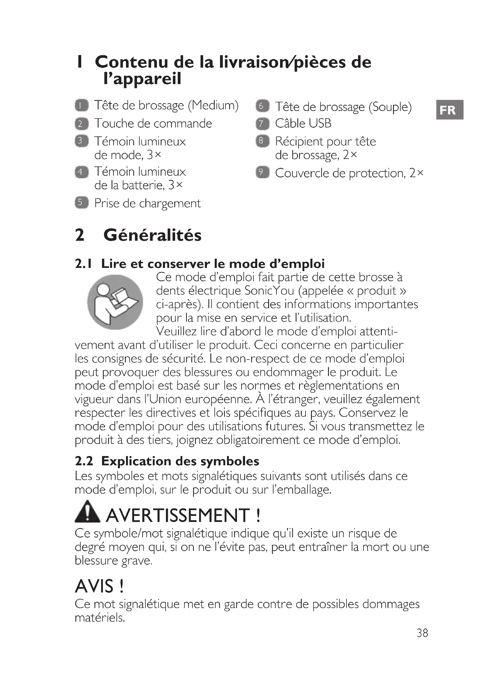 Table des matières 1 Contenu de la livraison⁄pièces de l’appareil __ 38 2 Généralités ________________________________ 38