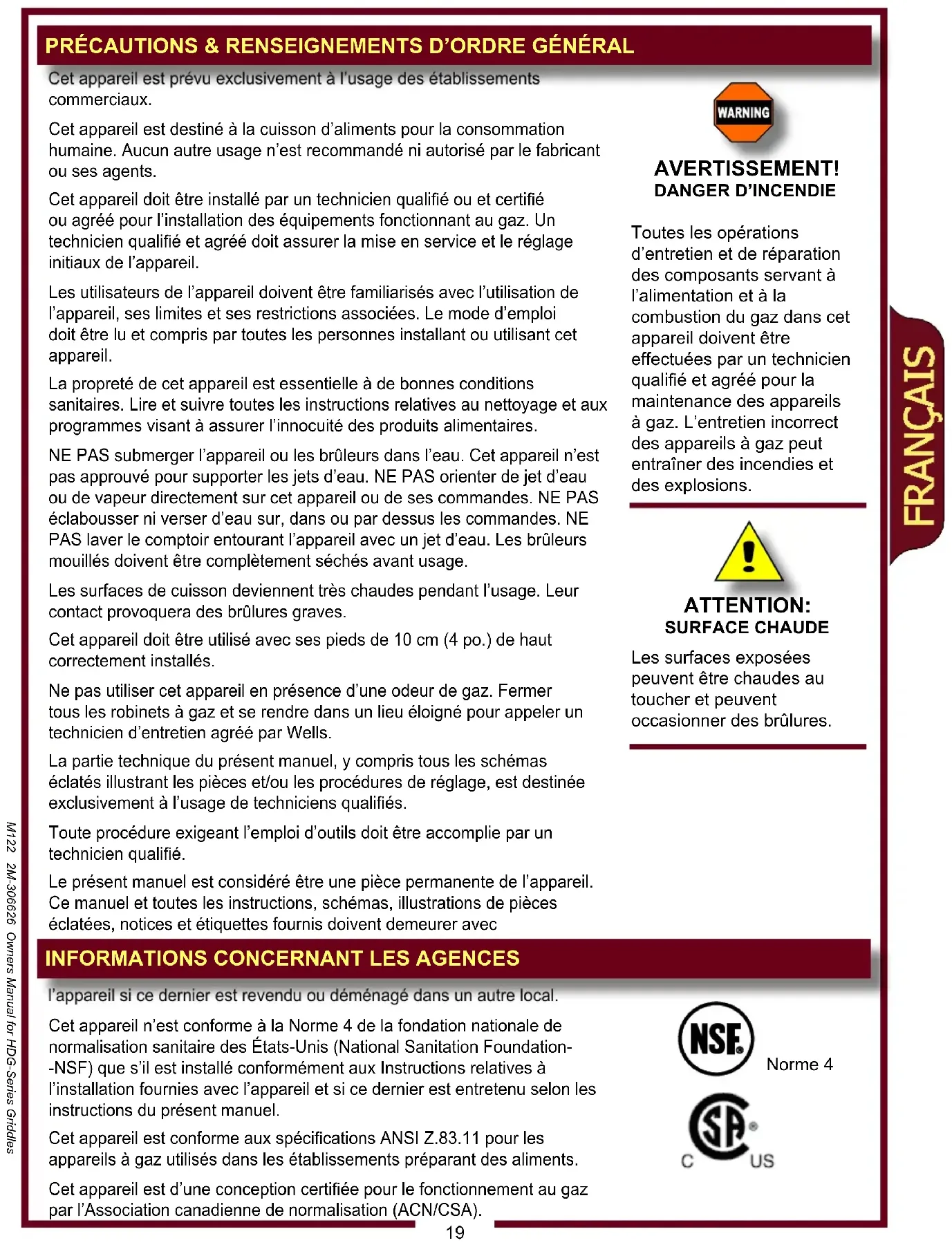 (STANDARD) L'AJUSTEMENT DE FLAMME D'ALLUMAGE CONDUIT D'ÉVACUATION DES GAZ ALLUMAGE DES BRÛLEURS IL2290 M122 2M-306626 Owners Manual for HDG-Series GriddlesCet appareil est prévu exclusivement à l’usage des établissements commerciaux. Cet appareil est destiné à la cuisson d’aliments pour la consommation humaine. Aucun autre usage n’est recommandé ni autorisé par le fabricant ou ses agents. Cet appareil doit être installé par un technicien qualié ou et certié ou agréé pour l’installation des équipements fonctionnant au gaz. Un technicien qualié et agréé doit assurer la mise en service et le réglage initiaux de l’appareil. Les utilisateurs de l’appareil doivent être familiarisés avec l’utilisation de l’appareil, ses limites et ses restrictions associées. Le mode d’emploi doit être lu et compris par toutes les personnes installant ou utilisant cet appareil. La propreté de cet appareil est essentielle à de bonnes conditions sanitaires. Lire et suivre toutes les instructions relatives au nettoyage et aux programmes visant à assurer l’innocuité des produits alimentaires. NE PAS submerger l’appareil ou les brûleurs dans l’eau. Cet appareil n’est pas approuvé pour supporter les jets d’eau. NE PAS orienter de jet d’eau ou de vapeur directement sur cet appareil ou de ses commandes. NE PAS éclabousser ni verser d’eau sur, dans ou par dessus les commandes. NE PAS laver le comptoir entourant l’appareil avec un jet d’eau. Les brûleurs mouillés doivent être complètement séchés avant usage. Les surfaces de cuisson deviennent très chaudes pendant l’usage. Leur contact provoquera des brûlures graves. Cet appareil doit être utilisé avec ses pieds de 10 cm (4 po.) de haut correctement installés. Ne pas utiliser cet appareil en présence d’une odeur de gaz. Fermer tous les robinets à gaz et se rendre dans un lieu éloigné pour appeler un technicien d’entretien agréé par Wells. La partie technique du présent manuel, y compris tous les schémas éclatés illustrant les pièces et/ou les procédures de réglage, est destinée exclusivement à l’usage de techniciens qualiés. Toute procédure exigeant l’emploi d’outils doit être accomplie par un technicien qualié. Le présent manuel est considéré être une pièce permanente de l’appareil. Ce manuel et toutes les instructions, schémas, illustrations de pièces éclatées, notices et étiquettes fournis doivent demeurer avec l’appareil si ce dernier est revendu ou déménagé dans un autre local. Cet appareil n’est conforme à la Norme 4 de la fondation nationale de normalisation sanitaire des États-Unis (National Sanitation Foundation- -NSF) que s’il est installé conformément aux Instructions relatives à l’installation fournies avec l’appareil et si ce dernier est entretenu selon les instructions du présent manuel. Cet appareil est conforme aux spécications ANSI Z.83.11 pour les appareils à gaz utilisés dans les établissements préparant des aliments. Cet appareil est d’une conception certiée pour le fonctionnement au gaz par l’Association canadienne de normalisation (ACN/CSA). AVERTISSEMENT!