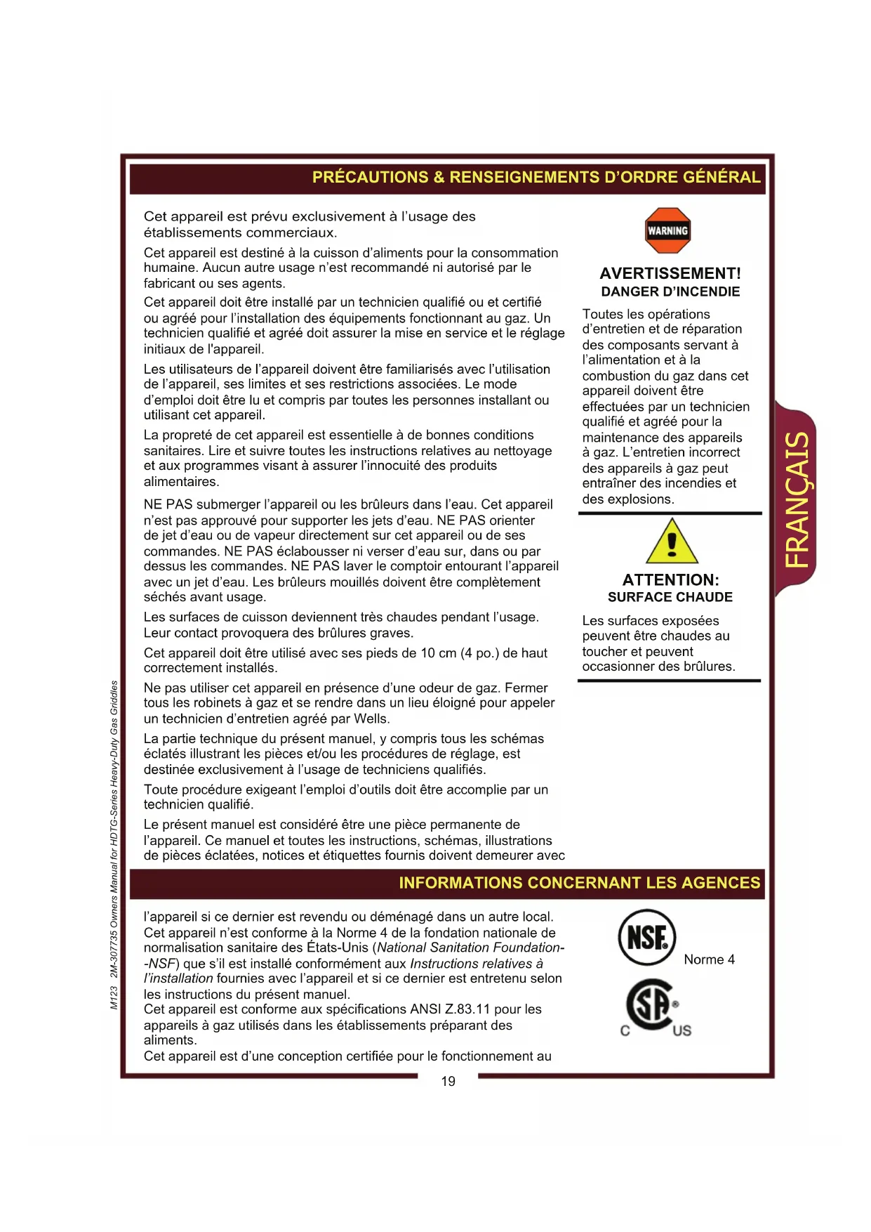 Cet appareil est destiné à la cuisson d’aliments pour la consommation humaine. Aucun autre usage n’est recommandé ni autorisé par le fabricant ou ses agents. Cet appareil doit être installé par un technicien qualifié ou et certifié ou agréé pour l’installation des équipements fonctionnant au gaz. Un technicien qualifié et agréé doit assurer la mise en service et le réglage initiaux de l'appareil. Les utilisateurs de l’appareil doivent être familiarisés avec l’utilisation de l’appareil, ses limites et ses restrictions associées. Le mode d’emploi doit être lu et compris par toutes les personnes installant ou utilisant cet appareil. La propreté de cet appareil est essentielle à de bonnes conditions sanitaires. Lire et suivre toutes les instructions relatives au nettoyage et aux programmes visant à assurer l’innocuité des produits alimentaires. NE PAS submerger l’appareil ou les brûleurs dans l’eau. Cet appareil n’est pas approuvé pour supporter les jets d’eau. NE PAS orienter de jet d’eau ou de vapeur directement sur cet appareil ou de ses commandes. NE PAS éclabousser ni verser d’eau sur, dans ou par dessus les commandes. NE PAS laver le comptoir entourant l’appareil avec un jet d’eau. Les brûleurs mouillés doivent être complètement séchés avant usage. Les surfaces de cuisson deviennent très chaudes pendant l’usage. Leur contact provoquera des brûlures graves. Cet appareil doit être utilisé avec ses pieds de 10 cm (4 po.) de haut correctement installés. Ne pas utiliser cet appareil en présence d’une odeur de gaz. Fermer tous les robinets à gaz et se rendre dans un lieu éloigné pour appeler un technicien d’entretien agréé par Wells. La partie technique du présent manuel, y compris tous les schémas éclatés illustrant les pièces et/ou les procédures de réglage, est destinée exclusivement à l’usage de techniciens qualifiés. Toute procédure exigeant l’emploi d’outils doit être accomplie par un technicien qualifié. Le présent manuel est considéré être une pièce permanente de l’appareil. Ce manuel et toutes les instructions, schémas, illustrations de pièces éclatées, notices et étiquettes fournis doivent demeurer avec l’appareil si ce dernier est revendu ou déménagé dans un autre local. Cet appareil n’est conforme à la Norme 4 de la fondation nationale de normalisation sanitaire des États-Unis (National Sanitation Foundation- -NSF) que s’il est installé conformément aux Instructions relatives à l’installation fournies avec l’appareil et si ce dernier est entretenu selon les instructions du présent manuel. Cet appareil est conforme aux spécifications ANSI Z.83.11 pour les appareils à gaz utilisés dans les établissements préparant des aliments. Cet appareil est d’une conception certifiée pour le fonctionnement au
