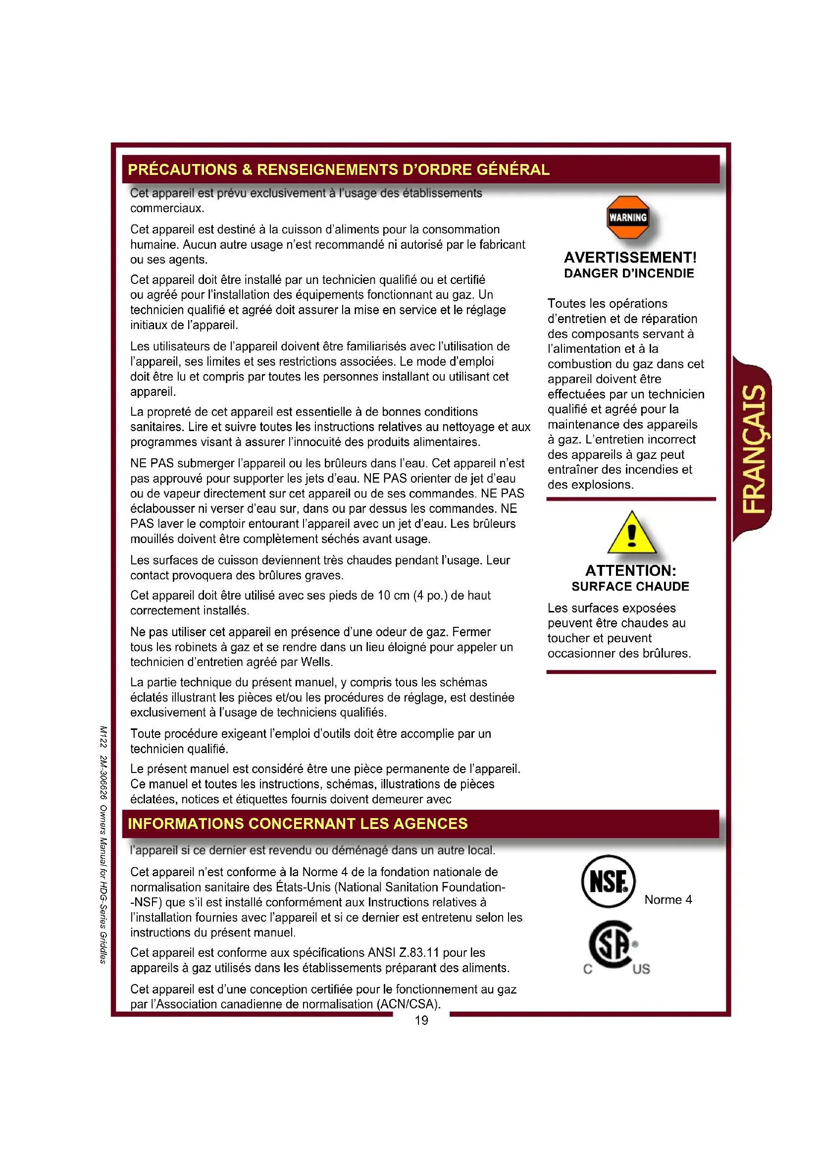 (STANDARD) L'AJUSTEMENT DE FLAMME D'ALLUMAGE CONDUIT D'ÉVACUATION DES GAZ ALLUMAGE DES BRÛLEURS IL2290 M122 2M-306626 Owners Manual for HDG-Series GriddlesCet appareil est prévu exclusivement à l’usage des établissements commerciaux. Cet appareil est destiné à la cuisson d’aliments pour la consommation humaine. Aucun autre usage n’est recommandé ni autorisé par le fabricant ou ses agents. Cet appareil doit être installé par un technicien qualié ou et certié ou agréé pour l’installation des équipements fonctionnant au gaz. Un technicien qualié et agréé doit assurer la mise en service et le réglage initiaux de l’appareil. Les utilisateurs de l’appareil doivent être familiarisés avec l’utilisation de l’appareil, ses limites et ses restrictions associées. Le mode d’emploi doit être lu et compris par toutes les personnes installant ou utilisant cet appareil. La propreté de cet appareil est essentielle à de bonnes conditions sanitaires. Lire et suivre toutes les instructions relatives au nettoyage et aux programmes visant à assurer l’innocuité des produits alimentaires. NE PAS submerger l’appareil ou les brûleurs dans l’eau. Cet appareil n’est pas approuvé pour supporter les jets d’eau. NE PAS orienter de jet d’eau ou de vapeur directement sur cet appareil ou de ses commandes. NE PAS éclabousser ni verser d’eau sur, dans ou par dessus les commandes. NE PAS laver le comptoir entourant l’appareil avec un jet d’eau. Les brûleurs mouillés doivent être complètement séchés avant usage. Les surfaces de cuisson deviennent très chaudes pendant l’usage. Leur contact provoquera des brûlures graves. Cet appareil doit être utilisé avec ses pieds de 10 cm (4 po.) de haut correctement installés. Ne pas utiliser cet appareil en présence d’une odeur de gaz. Fermer tous les robinets à gaz et se rendre dans un lieu éloigné pour appeler un technicien d’entretien agréé par Wells. La partie technique du présent manuel, y compris tous les schémas éclatés illustrant les pièces et/ou les procédures de réglage, est destinée exclusivement à l’usage de techniciens qualiés. Toute procédure exigeant l’emploi d’outils doit être accomplie par un technicien qualié. Le présent manuel est considéré être une pièce permanente de l’appareil. Ce manuel et toutes les instructions, schémas, illustrations de pièces éclatées, notices et étiquettes fournis doivent demeurer avec l’appareil si ce dernier est revendu ou déménagé dans un autre local. Cet appareil n’est conforme à la Norme 4 de la fondation nationale de normalisation sanitaire des États-Unis (National Sanitation Foundation- -NSF) que s’il est installé conformément aux Instructions relatives à l’installation fournies avec l’appareil et si ce dernier est entretenu selon les instructions du présent manuel. Cet appareil est conforme aux spécications ANSI Z.83.11 pour les appareils à gaz utilisés dans les établissements préparant des aliments. Cet appareil est d’une conception certiée pour le fonctionnement au gaz par l’Association canadienne de normalisation (ACN/CSA). AVERTISSEMENT!