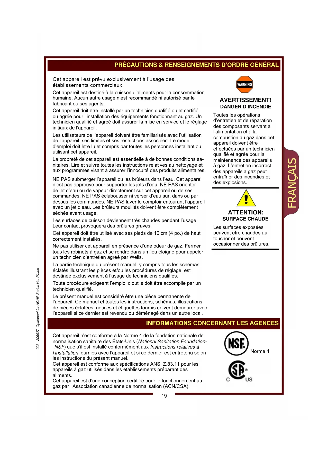 MAGE CORPOREL Les procédures d’installation doivent être accomplies par un technicien qualifié ayant pleine connaissance des dispositions des codes en vigueur relatives aux appareils à gaz. À défaut, des dommages corporels et matériels peuvent survenir. IMPORTANT : Tous les raccords de tuyauterie doivent être inspectés pour la détection de fuites éventuelles avant l’allumage. Détecter les fuites avec une solution d’eau savonneuse. IMPORTANT : L’information relative à la construction et l’installation des hottes d’aération doit être obtenue dans l’édition en vigueur de la norme NFPA 96 Standard for the Installation of Equipment for the Removal of Smoke and Grease Laden apors from Commercial Cooking Equip- ment. (Norme relative à l’installa- tion d’équipements destinés à l’extraction des fumées et des vapeurs chargées de graisse générées par les appareils de cuisson commerciaux.) Des exemplaires de cette norme sont disponibles auprès de l’Association nationale pour la protection contre les incendies (National Fire Protection Association—NFPA) NFPA 1 Batterymarch Park P.O. Box 9101 Quincy, MA 02269-9101 226 306627 OpManual for HDHP-Series Hot PlatesFRANÇAIS L'INSTALLATION (a continué)
