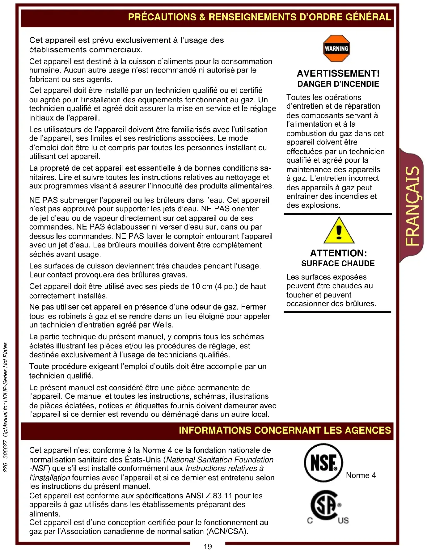 MAGE CORPOREL Les procédures d’installation doivent être accomplies par un technicien qualifié ayant pleine connaissance des dispositions des codes en vigueur relatives aux appareils à gaz. À défaut, des dommages corporels et matériels peuvent survenir. IMPORTANT : Tous les raccords de tuyauterie doivent être inspectés pour la détection de fuites éventuelles avant l’allumage. Détecter les fuites avec une solution d’eau savonneuse. IMPORTANT : L’information relative à la construction et l’installation des hottes d’aération doit être obtenue dans l’édition en vigueur de la norme NFPA 96 Standard for the Installation of Equipment for the Removal of Smoke and Grease Laden apors from Commercial Cooking Equip- ment. (Norme relative à l’installa- tion d’équipements destinés à l’extraction des fumées et des vapeurs chargées de graisse générées par les appareils de cuisson commerciaux.) Des exemplaires de cette norme sont disponibles auprès de l’Association nationale pour la protection contre les incendies (National Fire Protection Association—NFPA) NFPA 1 Batterymarch Park P.O. Box 9101 Quincy, MA 02269-9101 226 306627 OpManual for HDHP-Series Hot PlatesFRANÇAIS L'INSTALLATION (a continué)