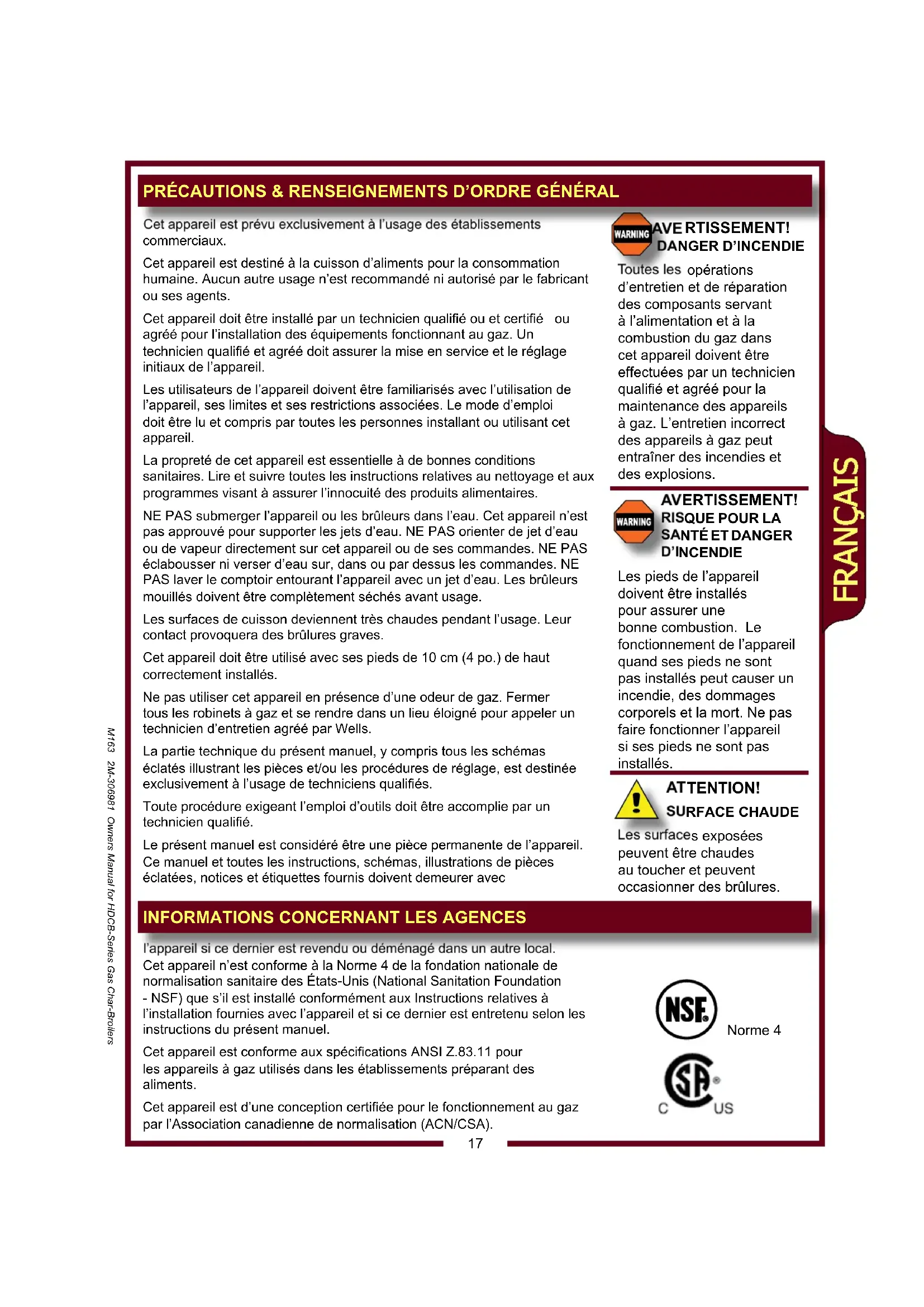 DU GAZ IL2301Cet appareil est prévu exclusivement à l’usage des établissements commerciaux. Cet appareil est destiné à la cuisson d’aliments pour la consommation humaine. Aucun autre usage n’est recommandé ni autorisé par le fabricant ou ses agents. Cet appareil doit être installé par un technicien qualié ou et certié ou agréé pour l’installation des équipements fonctionnant au gaz. Un technicien qualié et agréé doit assurer la mise en service et le réglage initiaux de l’appareil. Les utilisateurs de l’appareil doivent être familiarisés avec l’utilisation de l’appareil, ses limites et ses restrictions associées. Le mode d’emploi doit être lu et compris par toutes les personnes installant ou utilisant cet appareil. La propreté de cet appareil est essentielle à de bonnes conditions sanitaires. Lire et suivre toutes les instructions relatives au nettoyage et aux programmes visant à assurer l’innocuité des produits alimentaires. NE PAS submerger l’appareil ou les brûleurs dans l’eau. Cet appareil n’est pas approuvé pour supporter les jets d’eau. NE PAS orienter de jet d’eau ou de vapeur directement sur cet appareil ou de ses commandes. NE PAS éclabousser ni verser d’eau sur, dans ou par dessus les commandes. NE PAS laver le comptoir entourant l’appareil avec un jet d’eau. Les brûleurs mouillés doivent être complètement séchés avant usage. Les surfaces de cuisson deviennent très chaudes pendant l’usage. Leur contact provoquera des brûlures graves. Cet appareil doit être utilisé avec ses pieds de 10 cm (4 po.) de haut correctement installés. Ne pas utiliser cet appareil en présence d’une odeur de gaz. Fermer tous les robinets à gaz et se rendre dans un lieu éloigné pour appeler un technicien d’entretien agréé par Wells. La partie technique du présent manuel, y compris tous les schémas éclatés illustrant les pièces et/ou les procédures de réglage, est destinée exclusivement à l’usage de techniciens qualiés. Toute procédure exigeant l’emploi d’outils doit être accomplie par un technicien qualié. Le présent manuel est considéré être une pièce permanente de l’appareil. Ce manuel et toutes les instructions, schémas, illustrations de pièces éclatées, notices et étiquettes fournis doivent demeurer avec l’appareil si ce dernier est revendu ou déménagé dans un autre local. Cet appareil n’est conforme à la Norme 4 de la fondation nationale de normalisation sanitaire des États-Unis (National Sanitation Foundation - NSF) que s’il est installé conformément aux Instructions relatives à l’installation fournies avec l’appareil et si ce dernier est entretenu selon les instructions du présent manuel. Cet appareil est conforme aux spécications ANSI Z.83.11 pour les appareils à gaz utilisés dans les établissements préparant des aliments. Cet appareil est d’une conception certiée pour le fonctionnement au gaz par l’Association canadienne de normalisation (ACN/CSA). AVERTISSEMENT!