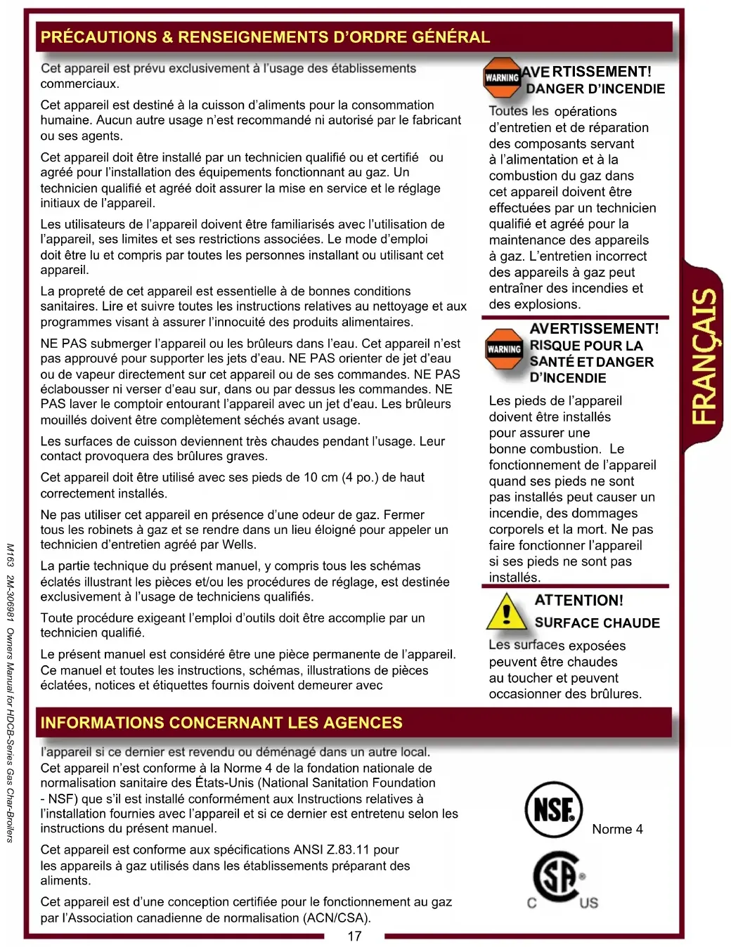 M163 2M-306981 Owners Manual for HDCB-Series Gas Char-BroilersAVERTISSEMENT: DANGER D’INCENDIE NE JAMAIS tenter de forcer ou de réparer un bouton ou robinet de commande bloqué. Pour toute réparation, contacter le distributeur agréé Wells. Les boutons ou robinets forcés ou mal réparés posent un risque d’incendie et/ou d’explosion .