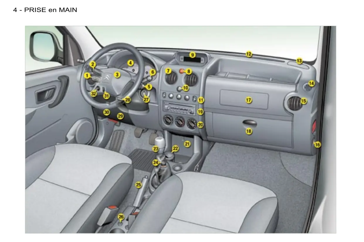 PRISE en MAIN - 5 Commande de sièges chauffants. Antivol et contact. Commande de réglage du volant. Commande d'ouverture du capot. Boîte à fusibles. Réglage en hauteur des projecteurs. Commande du rétroviseur électrique passager.