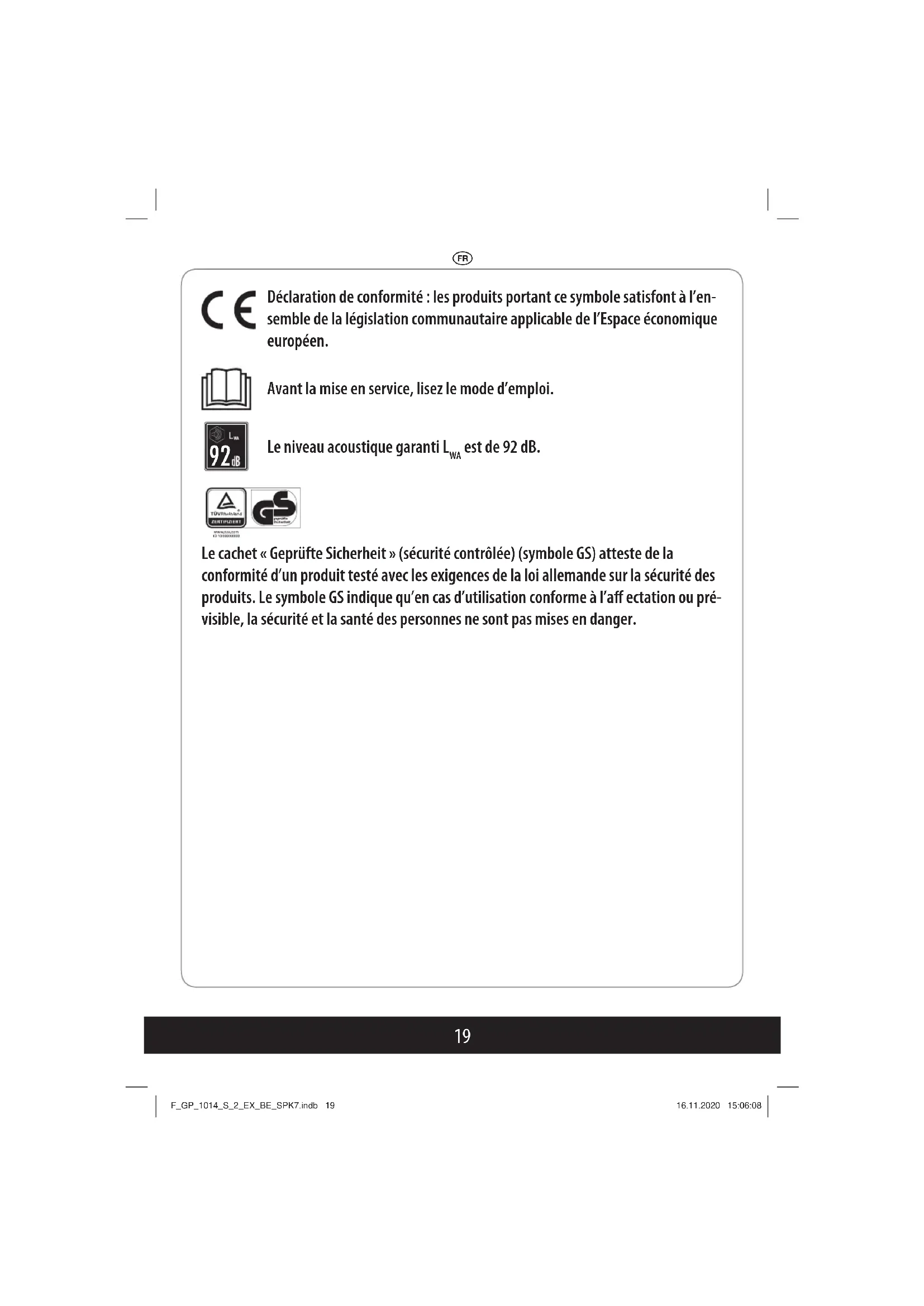 est de 92 dB. Le cachet « Geprüfte Sicherheit » (sécurité contrôlée) (symbole GS) atteste de la conformité d’un produit testé avec les exigences de la loi allemande sur la sécurité des produits. Le symbole GS indique qu’en cas d’utilisation conforme à l’aff ectation ou pré- visible, la sécurité et la santé des personnes ne sont pas mises en danger. F_GP_1014_S_2_EX_BE_SPK7.indb 19F_GP_1014_S_2_EX_BE_SPK7.indb 19 16.11.2020 15:06:0816.11.2020 15:06:08s