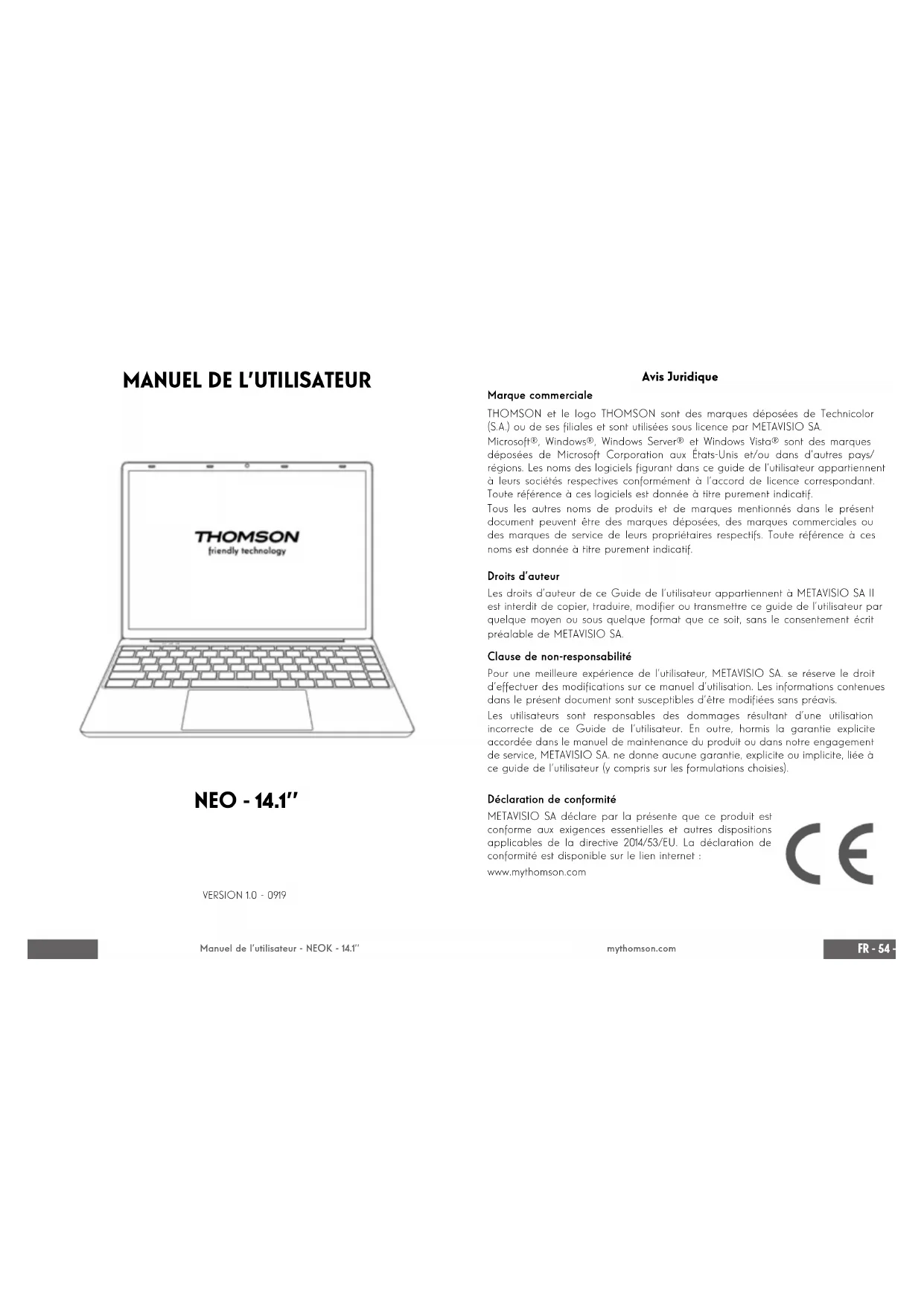 NEO - 14.1’’ VERSION 1.0 - 0919 Avis Juridique Marque commerciale THOMSON et le logo THOMSON sont des marques déposées de Technicolor (S.A.) ou de ses liales et sont utilisées sous licence par METAVISIO SA. Microsoft®, Windows®, Windows Server® et Windows Vista® sont des marques déposées de Microsoft Corporation aux États-Unis et/ou dans d’autres pays/ régions. Les noms des logiciels gurant dans ce guide de l’utilisateur appartiennent à leurs sociétés respectives conformément à l’accord de licence correspondant. Toute référence à ces logiciels est donnée à titre purement indicatif. Tous les autres noms de produits et de marques mentionnés dans le présent document peuvent être des marques déposées, des marques commerciales ou des marques de service de leurs propriétaires respectifs. Toute référence à ces noms est donnée à titre purement indicatif. Droits d’auteur Les droits d’auteur de ce Guide de l’utilisateur appartiennent à METAVISIO SA Il est interdit de copier, traduire, modier ou transmettre ce guide de l’utilisateur par quelque moyen ou sous quelque format que ce soit, sans le consentement écrit préalable de METAVISIO SA. Clause de non-responsabilité Pour une meilleure expérience de l’utilisateur, METAVISIO SA. se réserve le droit d’effectuer des modications sur ce manuel d’utilisation. Les informations contenues dans le présent document sont susceptibles d’être modiées sans préavis. Les utilisateurs sont responsables des dommages résultant d’une utilisation incorrecte de ce Guide de l’utilisateur. En outre, hormis la garantie explicite accordée dans le manuel de maintenance du produit ou dans notre engagement de service, METAVISIO SA. ne donne aucune garantie, explicite ou implicite, liée à ce guide de l’utilisateur (y compris sur les formulations choisies). Déclaration de conformité METAVISIO SA déclare par la présente que ce produit est conforme aux exigences essentielles et autres dispositions applicables de la directive 2014/53/EU. La déclaration de conformité est disponible sur le lien internet : www.mythomson.comFR - 76 - FR Manuel de l’utilisateur - NEOK - 14.1’’ mythomson.com - Consignes de sécurité importantes - Cet appareil doit être utilisée dans un environnement dont la température ambiante est comprise entre 5°C (41°F) et 35°C (95°F). Ne pas exposer l’appareil à la pluie ou à l’humidité et le tenir éloigné des liquides. En cas de projection d’eau ou d’un autre liquide sur l’appareil, éteindre immédiatement l’appareil et attendre qu’il soit complétement sec pour le remettre sous tension. N’exposez pas directement l‘appareil aux rayonnements solaires Ne pas utiliser de solvants puissants, de détergents liquides ou autres produits chimiques sur ou à proximité de la surface de la appareil, an d’éviter toute corrosion ou détérioration de la surface de l’appareil. Ne pas exposer l‘appareil à un environnement poussiéreux. Ne pas utiliser l’appareil durant une fuite de gaz. Ne pas exposer l’appareil à des champs magnétiques ou électriques puissants. Vous pouvez faire passer l‘appareil dans les détecteurs à rayons X des aéroports. Cependant, il est recommandé de ne pas faire passer votre appareil via les portiques de détection magnétique ni de l’exposer aux détecteurs portables. Ne placez pas d’objets sur l’appareil. Ne placez pas l‘appareil sur une surface inégale ou instable. Veillez à protéger l’appareil des chutes ou de tout autre choc pouvant l’endommager Ne pas laisser l‘appareil allumée ou en charge sur les genoux ou toutes autre partie du corps an d’éviter tous risques de blessures liées à la chaleur. Eteindre l’appareil avant de le transporter ou de le recouvrir d’une matière ne permettant une circulation de l’air optimale. Ne pas utiliser de cordons d’alimentation, d’accessoires ou d’autres périphériques endommagés avec votre appareil. Nous recommandons l’utilisation exclusive des accessoires (alimentation, câbles…) fournis avec l‘appareil. Utilisez exclusivement des batteries d’origine. Le remplacement de la batterie par une batterie incorrect peut entraîner un risque d’explosion Ne démontez pas, ne modiez pas ou ne réparez pas vous-même l’appareil, sous peine d’annulation de la garantie. Veuillez sauvegarder régulièrement vos contenus importants an d’éviter toute perte de données. Notre société rejette toute responsabilité en cas de perte ou de suppression d’éléments contenus dans l’appareil suite à une utilisation non conforme du matériel ou du logiciel, à un manque d’entretien ou à tout autre évènement accidentel. À pleine puissance, une écoute prolongée peut endommager l’audition de l’utilisateur. Ce produit a été conçu pour permettre un recyclage approprié des pièces et des composants. Le symbole représentant une poubelle à roue barrée indique que l’appareil ne doit pas être mis au rebut avec les déchets municipaux. Consulter les réglementations locales pour la mise au rebut des appareils électroniques. Le symbole représentant une poubelle à roue barrée indique que la batterie ne doit pas être mis au rebut avec les déchets municipaux. Consulter les réglementations locales pour la mise au rebut des batteries.FR - 98 - FR Manuel de l’utilisateur - NEOK - 14.1’’ mythomson.com - Présentation de l’appareil -