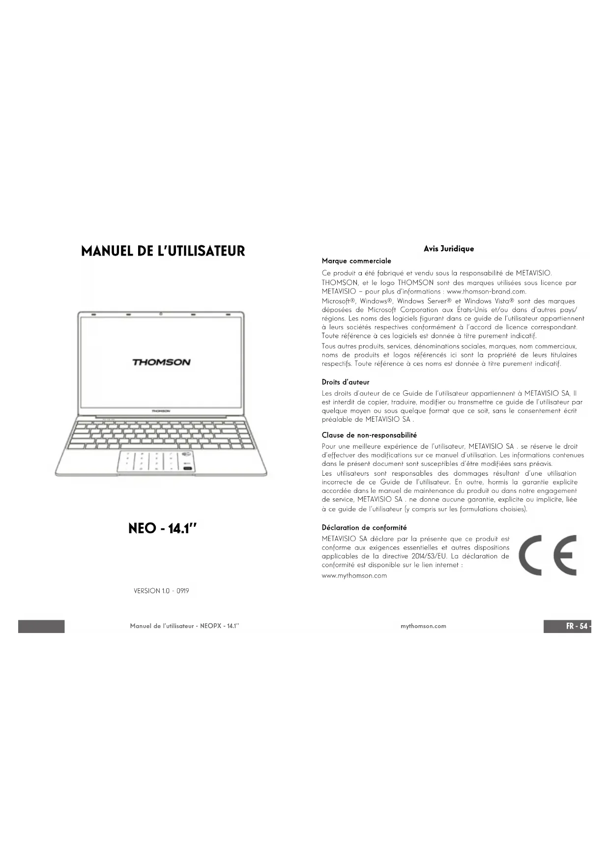 NEO - 14.1’’ VERSION 1.0 - 0919 Avis Juridique Marque commerciale Ce produit a été fabriqué et vendu sous la responsabilité de METAVISIO. THOMSON, et le logo THOMSON sont des marques utilisées sous licence par METAVISIO – pour plus d’informations : www.thomson-brand.com. Microsoft®, Windows®, Windows Server® et Windows Vista® sont des marques déposées de Microsoft Corporation aux États-Unis et/ou dans d’autres pays/ régions. Les noms des logiciels gurant dans ce guide de l’utilisateur appartiennent à leurs sociétés respectives conformément à l’accord de licence correspondant. Toute référence à ces logiciels est donnée à titre purement indicatif. Tous autres produits, services, dénominations sociales, marques, nom commerciaux, noms de produits et logos référencés ici sont la propriété de leurs titulaires respectifs. Toute référence à ces noms est donnée à titre purement indicatif. Droits d’auteur Les droits d’auteur de ce Guide de l’utilisateur appartiennent à METAVISIO SA, Il est interdit de copier, traduire, modier ou transmettre ce guide de l’utilisateur par quelque moyen ou sous quelque format que ce soit, sans le consentement écrit préalable de METAVISIO SA . Clause de non-responsabilité Pour une meilleure expérience de l’utilisateur, METAVISIO SA . se réserve le droit d’effectuer des modications sur ce manuel d’utilisation. Les informations contenues dans le présent document sont susceptibles d’être modiées sans préavis. Les utilisateurs sont responsables des dommages résultant d’une utilisation incorrecte de ce Guide de l’utilisateur. En outre, hormis la garantie explicite accordée dans le manuel de maintenance du produit ou dans notre engagement de service, METAVISIO SA . ne donne aucune garantie, explicite ou implicite, liée à ce guide de l’utilisateur (y compris sur les formulations choisies). Déclaration de conformité METAVISIO SA déclare par la présente que ce produit est conforme aux exigences essentielles et autres dispositions applicables de la directive 2014/53/EU. La déclaration de conformité est disponible sur le lien internet : www.mythomson.comFR - 76 - FR Manuel de l’utilisateur - NEOPX - 14.1’’ mythomson.com - Consignes de sécurité importantes - Cet appareil doit être utilisée dans un environnement dont la température ambiante est comprise entre 5°C (41°F) et 35°C (95°F). Ne pas exposer l’appareil à la pluie ou à l’humidité et le tenir éloigné des liquides. En cas de projection d’eau ou d’un autre liquide sur l’appareil, éteindre immédiatement l’appareil et attendre qu’il soit complétement sec pour le remettre sous tension. N’exposez pas directement l‘appareil aux rayonnements solaires Ne pas utiliser de solvants puissants, de détergents liquides ou autres produits chimiques sur ou à proximité de la surface de la appareil, an d’éviter toute corrosion ou détérioration de la surface de l’appareil. Ne pas exposer l‘appareil à un environnement poussiéreux. Ne pas utiliser l’appareil durant une fuite de gaz. Ne pas exposer l’appareil à des champs magnétiques ou électriques puissants. Vous pouvez faire passer l‘appareil dans les détecteurs à rayons X des aéroports. Cependant, il est recommandé de ne pas faire passer votre appareil via les portiques de détection magnétique ni de l’exposer aux détecteurs portables. Ne placez pas d’objets sur l’appareil. Ne placez pas l‘appareil sur une surface inégale ou instable. Veillez à protéger l’appareil des chutes ou de tout autre choc pouvant l’endommager Ne pas laisser l‘appareil allumée ou en charge sur les genoux ou toutes autre partie du corps an d’éviter tous risques de blessures liées à la chaleur. Eteindre l’appareil avant de le transporter ou de le recouvrir d’une matière ne permettant une circulation de l’air optimale. Ne pas utiliser de cordons d’alimentation, d’accessoires ou d’autres périphériques endommagés avec votre appareil. Nous recommandons l’utilisation exclusive des accessoires (alimentation, câbles…) fournis avec l‘appareil. Utilisez exclusivement des batteries d’origine. Le remplacement de la batterie par une batterie incorrect peut entraîner un risque d’explosion Ne démontez pas, ne modiez pas ou ne réparez pas vous-même l’appareil, sous peine d’annulation de la garantie. Veuillez sauvegarder régulièrement vos contenus importants an d’éviter toute perte de données. Notre société rejette toute responsabilité en cas de perte ou de suppression d’éléments contenus dans l’appareil suite à une utilisation non conforme du matériel ou du logiciel, à un manque d’entretien ou à tout autre évènement accidentel. An d’éviter des dommages auditifs éventuels, ne pas écouter à un niveau sonore élevé pendant une longue durée. Ce produit a été conçu pour permettre un recyclage approprié des pièces et des composants. Le symbole représentant une poubelle à roue barrée indique que l’appareil ne doit pas être mis au rebut avec les déchets municipaux. Consulter les réglementations locales pour la mise au rebut des appareils électroniques. Le symbole représentant une poubelle à roue barrée indique que la batterie ne doit pas être mis au rebut avec les déchets municipaux. Consulter les réglementations locales pour la mise au rebut des batteries.FR - 98 - FR Manuel de l’utilisateur - NEOPX - 14.1’’ mythomson.com - Présentation de l’appareil -
