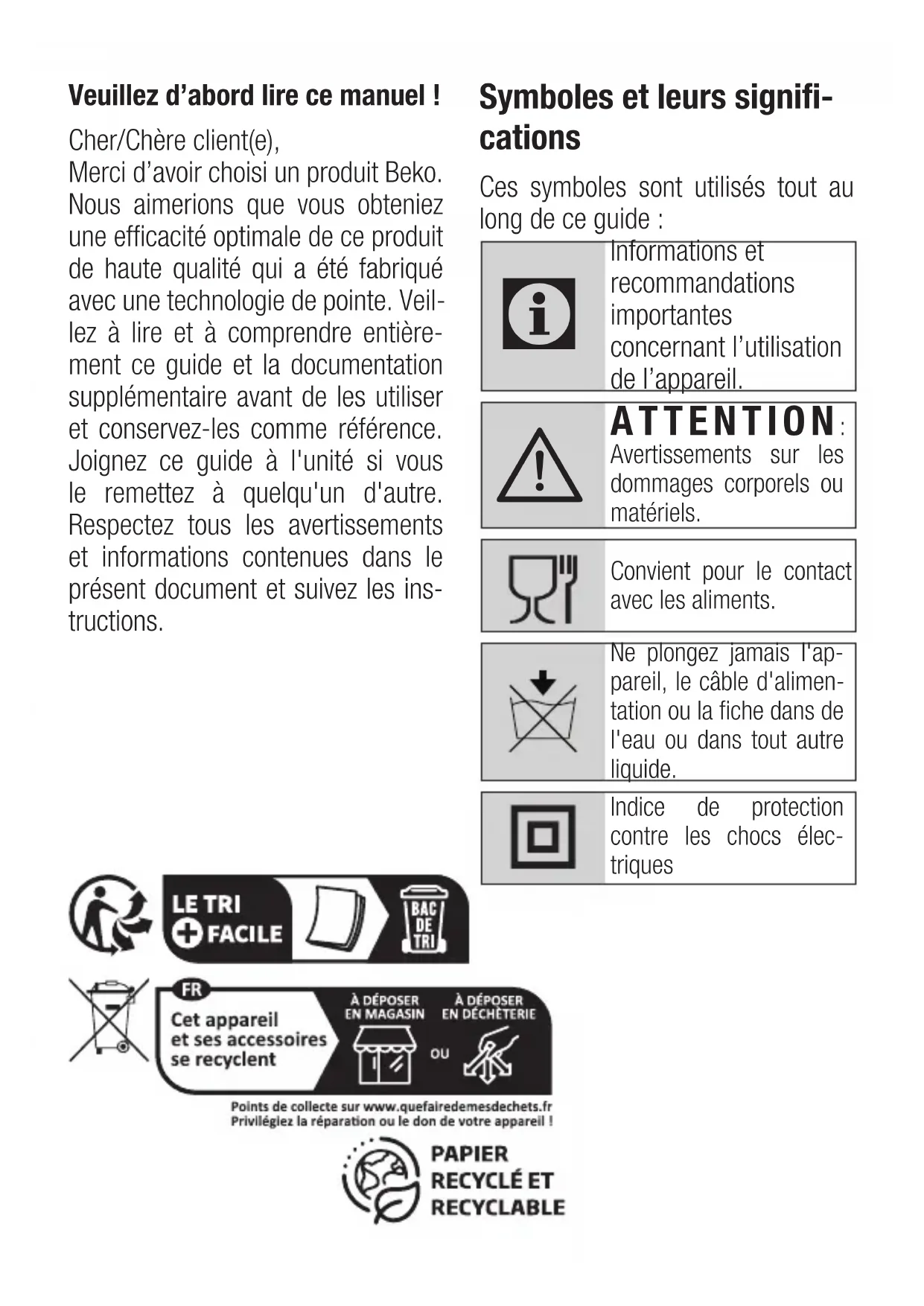 Diese Garantiezusage ist nur gültig innerhalb der Bundesrepublik Deutschland Garantiebedingungen - Beko – Version Februar 2021Veuillez d’abord lire ce manuel ! Cher/Chère client(e), Merci d’avoir choisi un produit Beko. Nous aimerions que vous obteniez une efficacité optimale de ce produit de haute qualité qui a été fabriqué avec une technologie de pointe. Veil- lez à lire et à comprendre entière- ment ce guide et la documentation supplémentaire avant de les utiliser et conservez-les comme référence. Joignez ce guide à l'unité si vous le remettez à quelqu'un d'autre. Respectez tous les avertissements et informations contenues dans le présent document et suivez les ins- tructions. Symboles et leurs signifi- cations Ces symboles sont utilisés tout au long de ce guide :