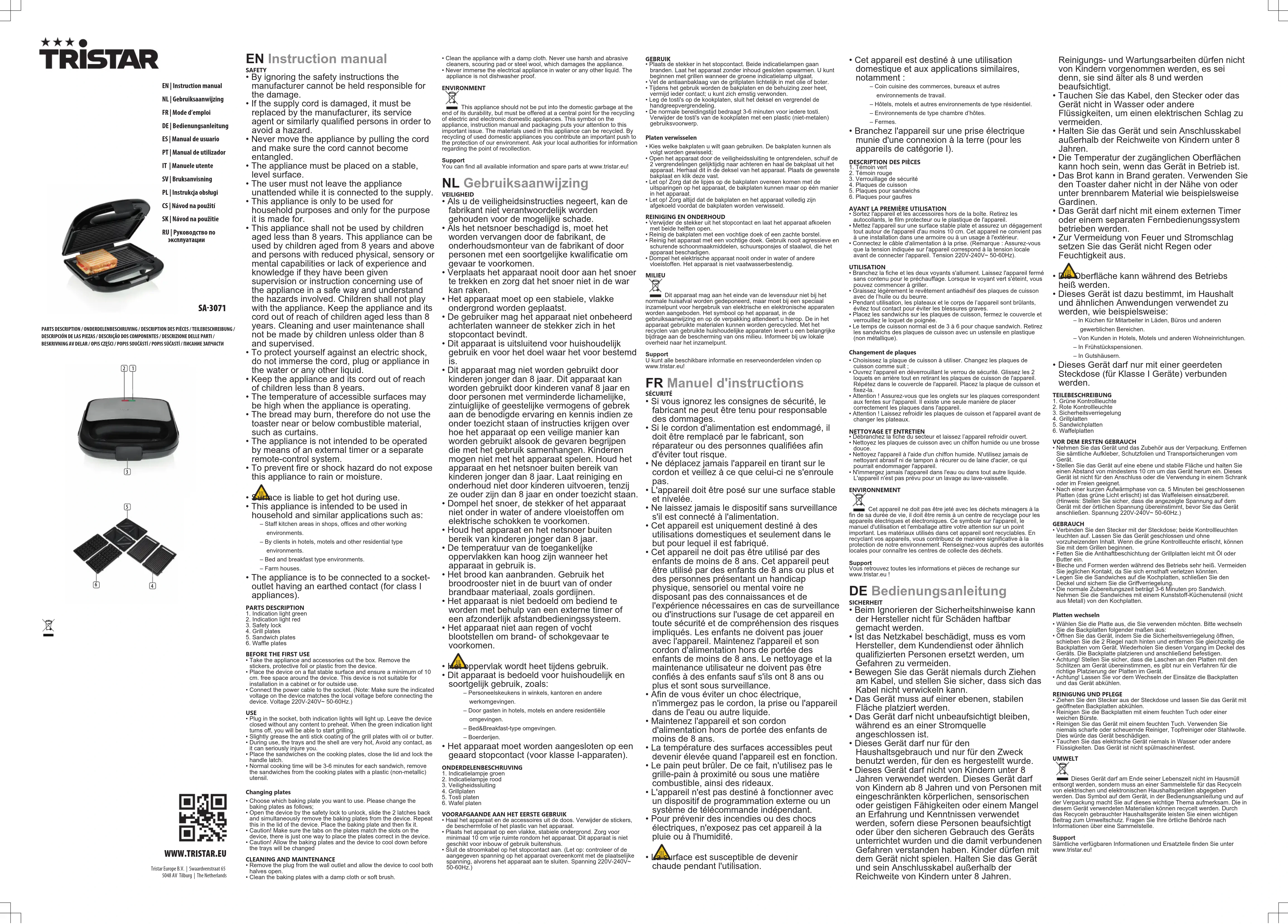 - Branchez l'appareil sur une prise électrique munie d'une connexion à la terre (pour les appareils de catégorie I). DESCRIPTION DES PIÈCES1. Témoin vert2. Témoin rouge3. Verrouillage de sécurité4. Plaques de cuisson5. Plaques pour sandwichs6. Plaques pour gaufresAVANT LA PREMIÈRE UTILISATION• Sortez l'appareil et les accessoires hors de la boîte.Retirez lesautocollants, le film protecteur ou le plastique de l'appareil.• Mettez l'appareil sur une surface stable plate et assurez un dégagementtout autour de l'appareil d'au moins 10 cm. Cet appareil ne convient pasà une installation dans une armoire ou à un usage à l'extérieur.• Connectez le câble d'alimentation à la prise. (Remarque : Assurez-vousque la tension indiquée sur l'appareil correspond à la tension localeavant de connecter l'appareil. Tension 220V-240V~ 50-60Hz).UTILISATION• Branchez la fiche et les deux voyants s'allument. Laissez l'appareil fermésans contenu pour le préchauffage. Lorsque le voyant vert s'éteint, vouspouvez commencer à griller.• Graissez légèrement le revêtement antiadhésif des plaques de cuissonavec de l’huile ou du beurre.• Pendant utilisation, les plateaux et le corps de l’appareil sont brûlants,évitez tout contact pour éviter les blessures graves.• Placez les sandwichs sur les plaques de cuisson, fermez le couvercle etverrouillez le loquet de poignée.• Le temps de cuisson normal est de 3 à 6 pour chaque sandwich. Retirezles sandwichs des plaques de cuisson avec un ustensile en plastique(non métallique).Changement de plaques• Choisissez la plaque de cuisson à utiliser. Changez les plaques decuisson comme suit ;• Ouvrez l'appareil en déverrouillant le verrou de sécurité. Glissez les 2loquets en arrière tout en retirant les plaques de cuisson de l'appareil.Répétez dans le couvercle de l'appareil. Placez la plaque de cuisson etfixez-la.• Attention! Assurez-vous que les onglets sur les plaques correspondentaux fentes sur l'appareil. Il existe une seule manière de placercorrectement les plaques dans l'appareil.• Attention! Laissez refroidir les plaques de cuisson et l'appareil avant dechanger les plateaux.NETTOYAGE ET ENTRETIEN• Débranchez la fiche du secteur et laissez l’appareil refroidir ouvert.• Nettoyez les plaques de cuisson avec un chiffon humide ou une brossedouce.• Nettoyez l'appareil à l'aide d'un chiffon humide. N'utilisez jamais denettoyant abrasif ni de tampon à récurer ou de laine d'acier, ce quipourrait endommager l'appareil.• N'immergez jamais l'appareil dans l'eau ou dans tout autre liquide.L'appareil n'est pas prévu pour un lavage au lave-vaisselle.ENVIRONNEMENTCet appareil ne doit pas être jeté avec les déchets ménagers à lafin de sa durée de vie, il doit être remis à un centre de recyclage pour lesappareils électriques et électroniques. Ce symbole sur l'appareil, lemanuel d'utilisation et l'emballage attire votre attention sur un pointimportant. Les matériaux utilisés dans cet appareil sont recyclables. Enrecyclant vos appareils, vous contribuez de manière significative à laprotection de notre environnement. Renseignez-vous auprès des autoritéslocales pour connaître les centres de collecte des déchets.SupportVous retrouvez toutes les informations et pièces de rechange surwww.tristar.eu! DEBedienungsanleitung SICHERHEIT