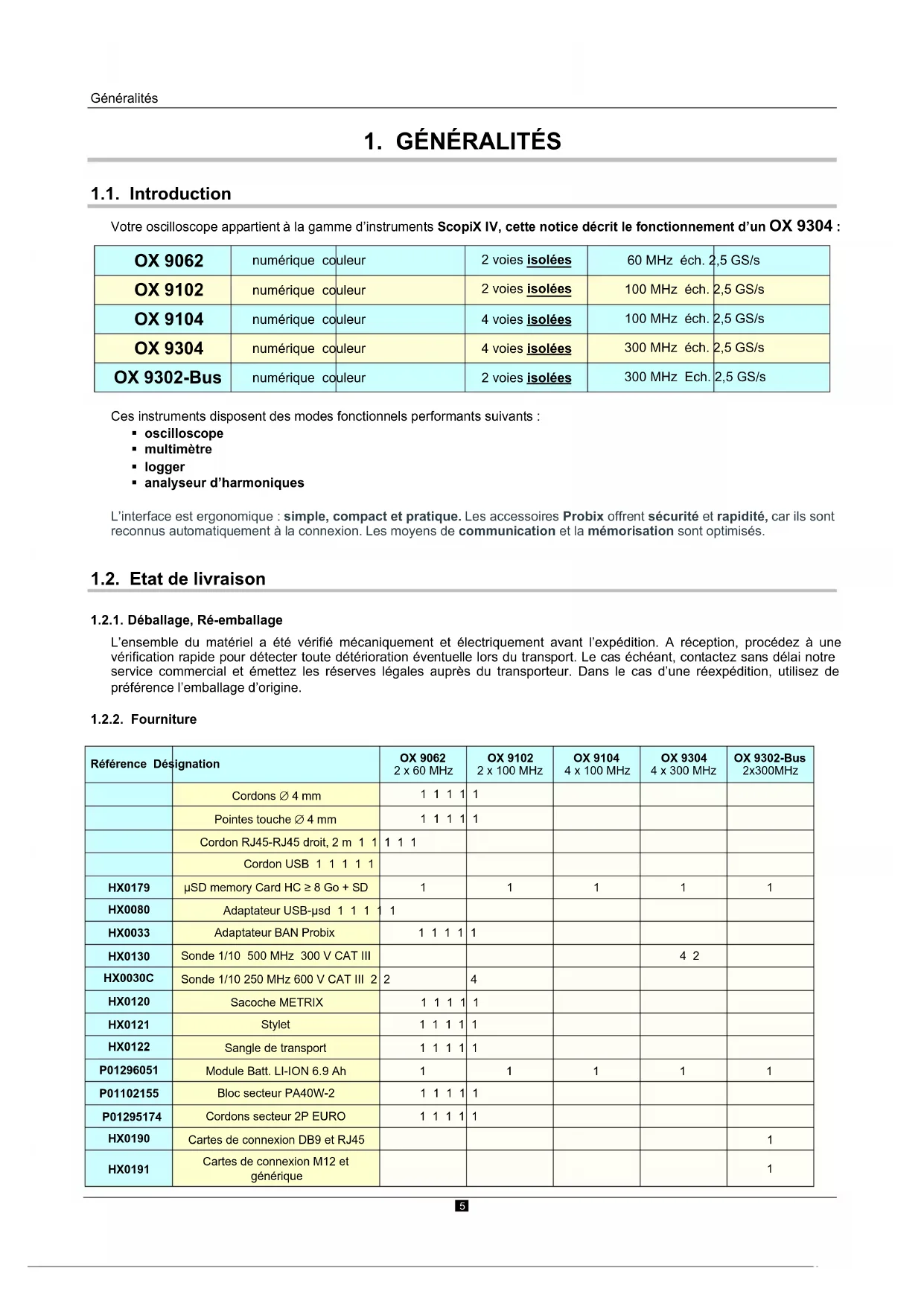 1.1. Introduction Votre oscilloscope appartient à la gamme d’instruments ScopiX IV, cette notice décrit le fonctionnement d’un OX 9304 : OX 9062 numérique couleur 2 voies isolées 60 MHz éch. 2,5 GS/s OX 9102 numérique couleur 2 voies isolées 100 MHz éch. 2,5 GS/s OX 9104 numérique couleur 4 voies isolées 100 MHz éch. 2,5 GS/s OX 9304 numérique couleur 4 voies isolées 300 MHz éch. 2,5 GS/s OX 9302-Bus numérique couleur 2 voies isolées 300 MHz Ech. 2,5 GS/s Ces instruments disposent des modes fonctionnels performants suivants : oscilloscope multimètre logger analyseur d’harmoniques L’interface est ergonomique : simple, compact et pratique. Les accessoires Probix offrent sécurité et rapidité, car ils sont reconnus automatiquement à la connexion. Les moyens de communication et la mémorisation sont optimisés. 1.2. Etat de livraison