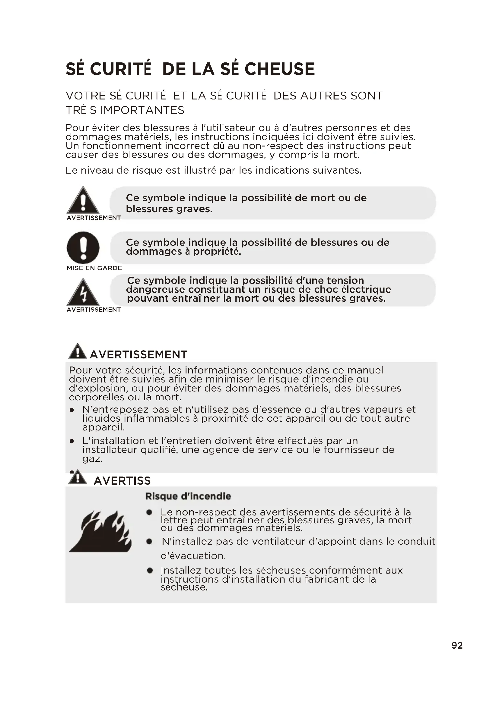 Ne séchez pas d'articles qui ont été préalablement nettoyés, lavés, trempés ou tachés d'essence, de solvants de nettoyage à sec ou d'autres substances inflammables ou explosives. Ils émettent des vapeurs qui pourraient s'enflammer ou exploser. Tout matériau ayant été en contact avec un solvant de nettoyage ou des liquides ou solides inflammables ne doit pas être placé dans la sécheuse tant que toutes les traces de ces liquides ou solides inflammables et de leurs vapeurs n'ont pas été éliminées.
