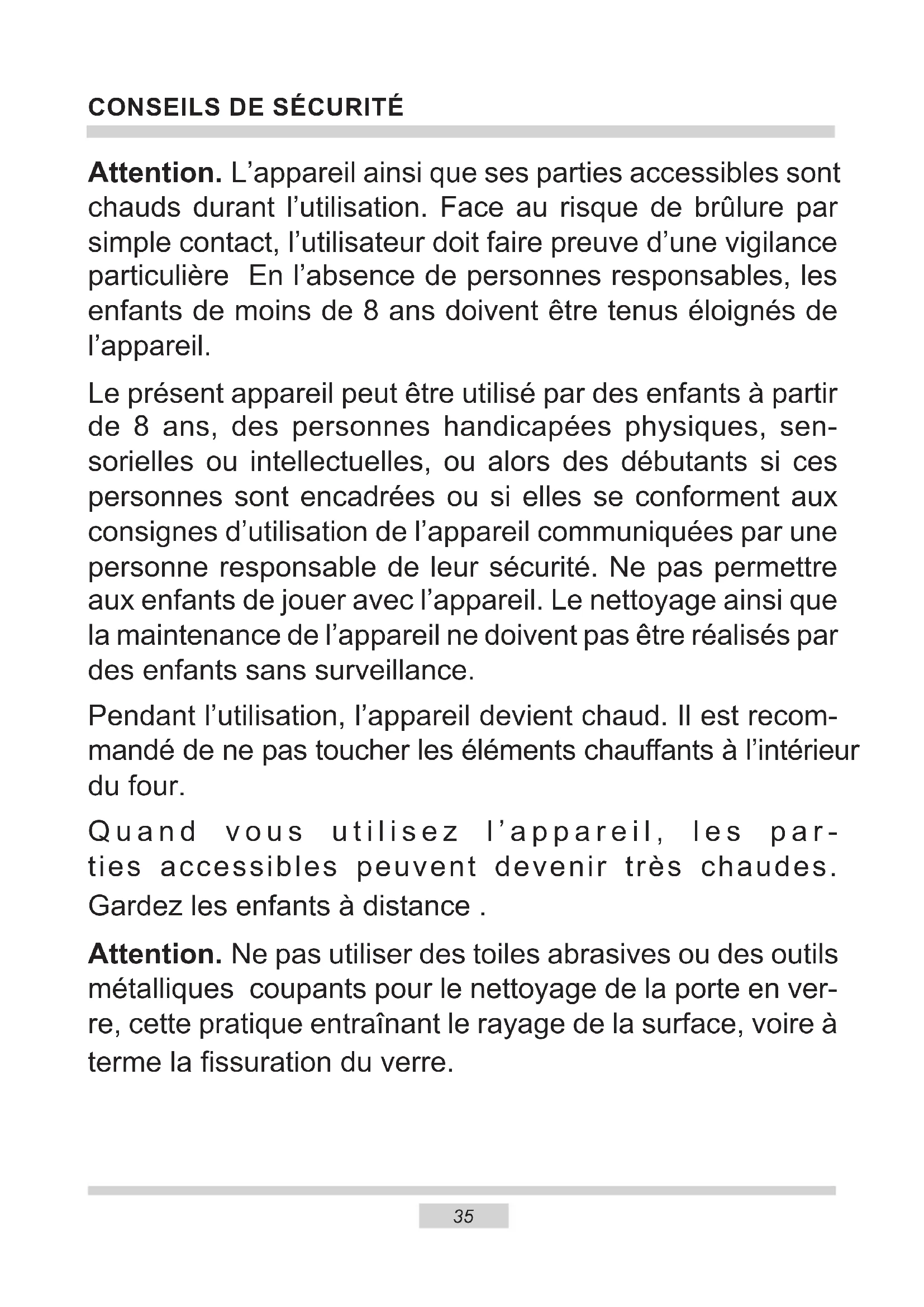 Attention. L’appareil ainsi que ses parties accessibles sont chauds durant l’utilisation. Face au risque de brûlure par simple contact, l’utilisateur doit faire preuve d’une vigilance particulière En l’absence de personnes responsables, les enfants de moins de 8 ans doivent être tenus éloignés de l’appareil. Le présent appareil peut être utilisé par des enfants à partir de 8 ans, des personnes handicapées physiques, sen- sorielles ou intellectuelles, ou alors des débutants si ces personnes sont encadrées ou si elles se conforment aux consignes d’utilisation de l’appareil communiquées par une personne responsable de leur sécurité. Ne pas permettre aux enfants de jouer avec l’appareil. Le nettoyage ainsi que la maintenance de l’appareil ne doivent pas être réalisés par des enfants sans surveillance. Pendant l’utilisation, l’appareil devient chaud. Il est recom- mandé de ne pas toucher les éléments chauants à l’intérieur du four. Quand vous utilisez l’appareil, les par- ties accessibles peuvent devenir très chaudes. Gardez les enfants à distance . Attention. Ne pas utiliser des toiles abrasives ou des outils métalliques coupants pour le nettoyage de la porte en ver- re, cette pratique entraînant le rayage de la surface, voire à terme la ssuration du verre.36