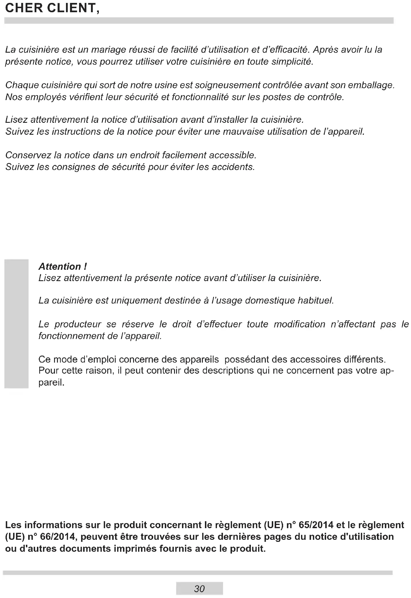 Déclaration du producteur Le producteur déclare que le produit est conforme aux exigences déterminées dans les directives UE : l directive « basse tension » 2014/35/EC, l directive « compatibilité électromagnétique » 2014/30/EC, ldirective « ErP » 2009/125/EC, c’est pourquoi, le produit porte une marque appropriée et est accompagné d’une déclaration de confor- mité destinée aux autorités de surveillance du marché. Le produit est conforme aux normes EN 60335-1, EN 60335-2-6, en vigueur dans l’Union européenne. Les données sur l’étiquetage énergétique des fours électriques sont indiquées conformément à la norme EN 60350-1 /CEI 60350-1. Ces données sont dénies pour des charges standard avec les fonctions actives : éléments chauants inférieur et supérieur (mode conventionnel) et réchauement avec l’assistance du ventilateur (si ces fonctions sont accessibles). La classe d’ecacité énergétique est dénie selon la fonction accessible dans le produit conformément à la priorité ci-dessous : Pour dénir la consommation d’énergie, démonter les glissières télescopiques (si le produit dispose de cet équipement). Circuit d’air forcé ECO (chaleur tournante + ventilateur) Circuit d’air forcé ECO (élément chauant inférieur + supérieur + grill + ventilateur) Mode conventionnel ECO (élément chauant inférieur + supérieur) Tension nominale 230V ~ 50 Hz Puissance nominale 3,6 kW (Largeur/Hauteur/Profondeur) 59,5 x 59,5 x 57,5 cm57 DEAR CUSTOMER, The oven is exceptionally easy to use and extremely ecient. After reading the instruction manual, operating the oven will be easy. Before being packaged and leaving the manufacturer, the oven was thoroughly checked with regard to safety and functionality. Before using the appliance, please read the instruction manual carefully. By following these instructions carefully you will be able to avoid any problems in using the appliance. It is important to keep the instruction manual and store it in a safe place so that it can be consulted at any time. It is necessary to follow the instructions in the manual carefully in order to avoid possible accidents. Caution! Do not use the cooker until you have read this instruction manual. The cooker is intended for household use only. The manufacturer reserves the right to introduce changes which do not aect the operation of the appliance. This manual is prepared for appliances of dierent equipment. Therefore, functions may be described that do not necessarily apply to your product. Information about the product concerning Regulation (EU) No 65/2014 and Regulation (EU) No 66/2014, can be found on the last pages of the user manual or in other printed documents provided with the product. EN58 SAFETY INSTRUCTIONS