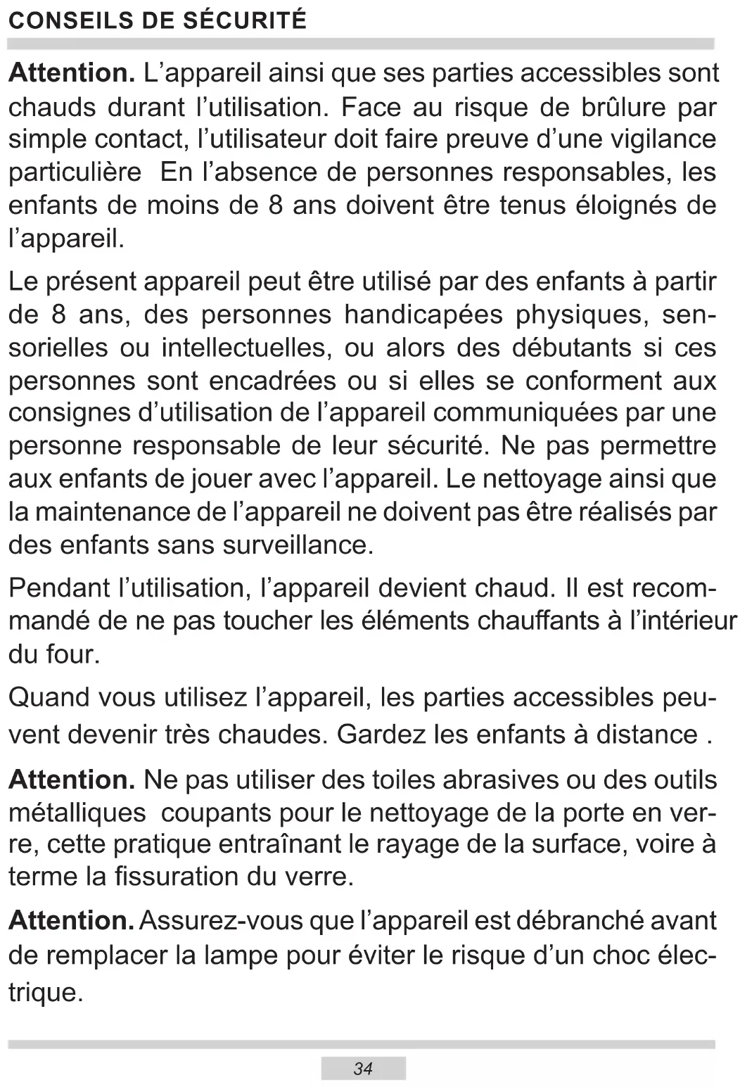 Attention. L’appareil ainsi que ses parties accessibles sont chauds durant l’utilisation. Face au risque de brûlure par simple contact, l’utilisateur doit faire preuve d’une vigilance particulière En l’absence de personnes responsables, les enfants de moins de 8 ans doivent être tenus éloignés de l’appareil. Le présent appareil peut être utilisé par des enfants à partir de 8 ans, des personnes handicapées physiques, sen- sorielles ou intellectuelles, ou alors des débutants si ces personnes sont encadrées ou si elles se conforment aux consignes d’utilisation de l’appareil communiquées par une personne responsable de leur sécurité. Ne pas permettre aux enfants de jouer avec l’appareil. Le nettoyage ainsi que la maintenance de l’appareil ne doivent pas être réalisés par des enfants sans surveillance. Pendant l’utilisation, l’appareil devient chaud. Il est recom- mandé de ne pas toucher les éléments chauants à l’intérieur du four. Quand vous utilisez l’appareil, les parties accessibles peu- vent devenir très chaudes. Gardez les enfants à distance . Attention. Ne pas utiliser des toiles abrasives ou des outils métalliques coupants pour le nettoyage de la porte en ver- re, cette pratique entraînant le rayage de la surface, voire à terme la ssuration du verre. Attention. Assurez-vous que l’appareil est débranché avant de remplacer la lampe pour éviter le risque d’un choc élec- trique.35