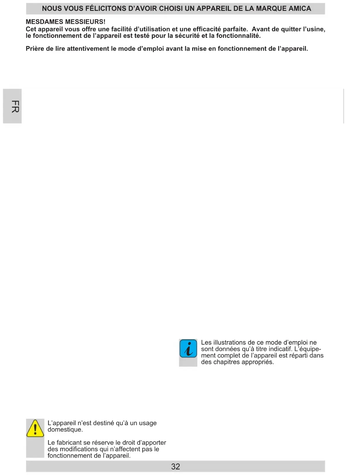 Manufacturer’s Declaration The manufacturer hereby declares that this product meets the requirements of the following European directives: ● Low Voltage Directive 2014/35/EC, ● Electromagnetic Compatibility (EMC) Directive 2014/30/EC, ● ErP Directive 2009/125/EC ● Directive RoHS 2011/65/EC and has thus been marked with the symbol and been issued with a declaration of compliance made available to market regulators. Warranty Warranty service as stated on the warranty card The manufacturer shall not be held liable for any damage caused by improper use of the product. EN32 Cet appareil vous offre une facilité d’utilisation et une efcacité parfaite. Avant de quitter l’usine, le fonctionnement de l’appareil est testé pour la sécurité et la fonctionnalité. Prière de lire attentivement le mode d’emploi avant la mise en fonctionnement de l’appareil. MESDAMES MESSIEURS! NOUS VOUS FÉLICITONS D’AVOIR CHOISI UN APPAREIL DE LA MARQUE AMICA L’appareil n’est destiné qu’à un usage domestique. Le fabricant se réserve le droit d’apporter des modications qui n’affectent pas le fonctionnement de l’appareil.