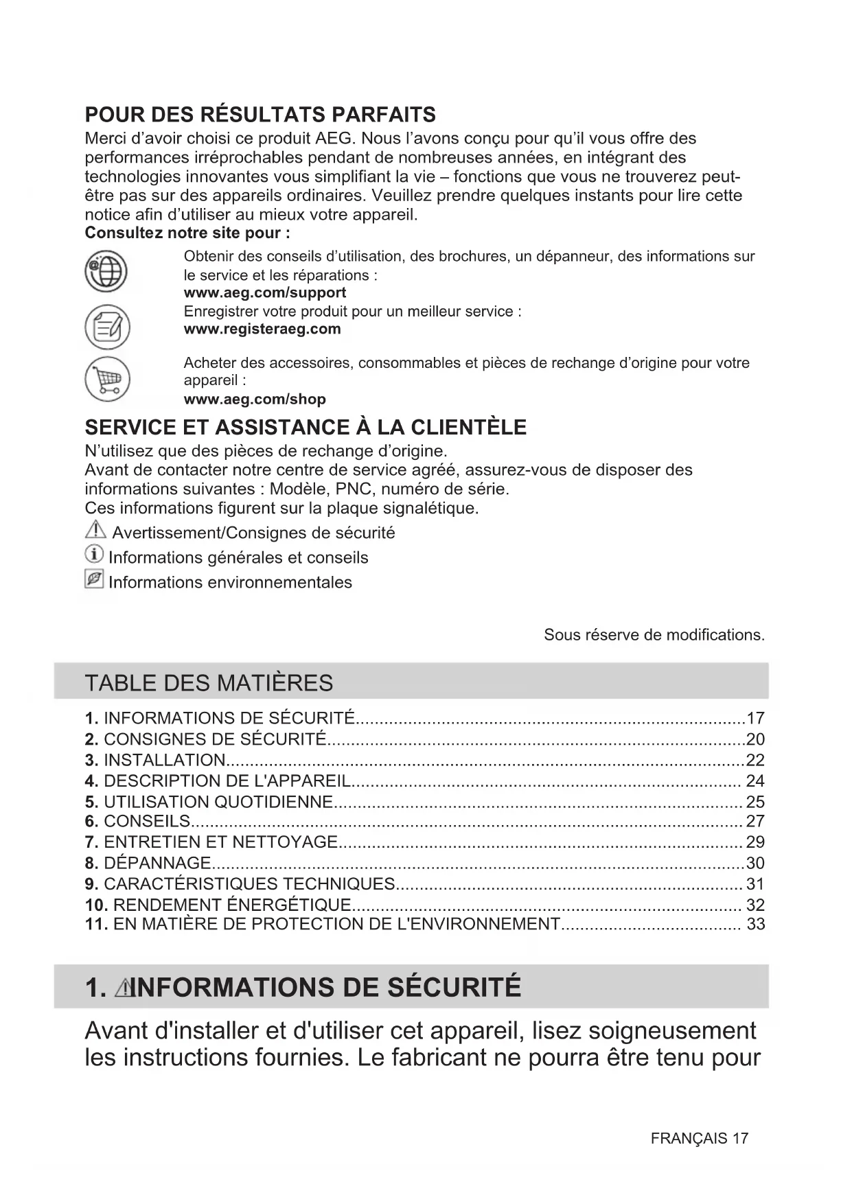 Merci d’avoir choisi ce produit AEG. Nous l’avons conçu pour qu’il vous offre des performances irréprochables pendant de nombreuses années, en intégrant des technologies innovantes vous simplifiant la vie – fonctions que vous ne trouverez peut- être pas sur des appareils ordinaires. Veuillez prendre quelques instants pour lire cette notice afin d’utiliser au mieux votre appareil. Consultez notre site pour :Obtenir des conseils d’utilisation, des brochures, un dépanneur, des informations surle service et les réparations :www.aeg.com/supportEnregistrer votre produit pour un meilleur service :www.registeraeg.comAcheter des accessoires, consommables et pièces de rechange d’origine pour votreappareil :www.aeg.com/shop