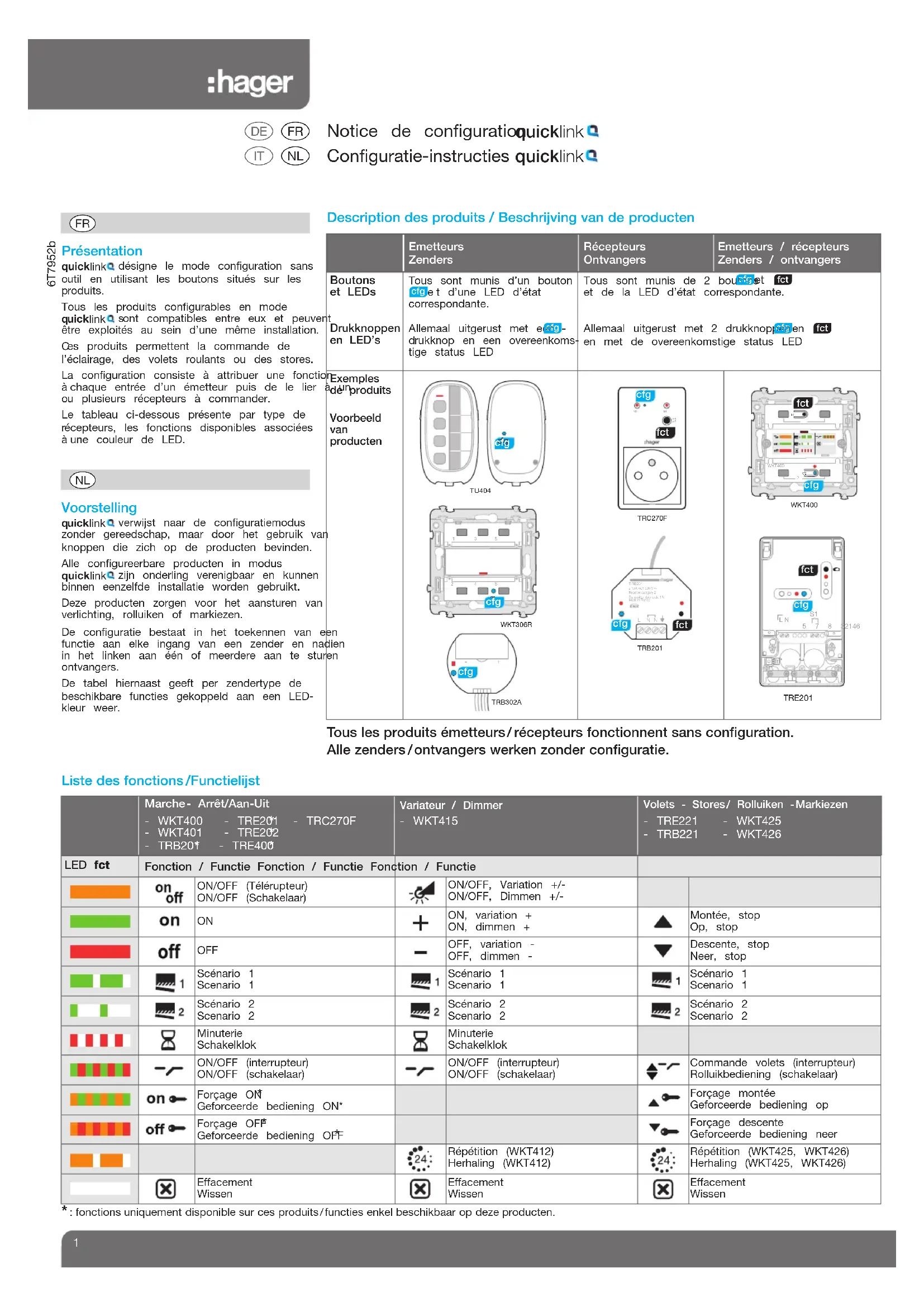 6T7952bLED fctFonction / Functie Fonction / Functie Fonction / FunctieON/OFF (Télérupteur)ON/OFF (Schakelaar)ON/OFF, Variation +/-ON/OFF, Dimmen +/- ON, variation +ON, dimmen +Montée, stopOp, stop OFF OFF, variation -OFF, dimmen -Descente, stopNeer, stopScénario 1Scenario 1Scénario 1Scenario 1Scénario 1Scenario 1Scénario 2Scenario 2Scénario 2Scenario 2Scénario 2Scenario 2MinuterieSchakelklokMinuterieSchakelklokON/OFF (interrupteur)ON/OFF (schakelaar)ON/OFF (interrupteur)ON/OFF (schakelaar)Commande volets (interrupteur)Rolluikbediening (schakelaar)Forçage ON Geforceerde bediening ON*Forçage montéeGeforceerde bediening opForçage OFF Geforceerde bediening OFF Forçage descenteGeforceerde bediening neerRépétition (WKT412)Herhaling (WKT412)Répétition (WKT425, WKT426)Herhaling (WKT425, WKT426)EffacementWissenEffacementWissenEffacementWissen Présentation désigne le mode configuration sans util en utilisant les boutons situés sur les roduits.Tous les produits configurables en mode ont compatibles entre eux et peuvent tre exploités au sein d’une même installation. es produits permettent la commande del’éclairage, des volets roulants ou des stores. a configuration consiste à attribuer une fonction chaque entrée d’un émetteur puis de le lier à un u plusieurs récepteurs à commander.Le tableau ci-dessous présente par type de écepteurs, les fonctions disponibles associées une couleur de LED.