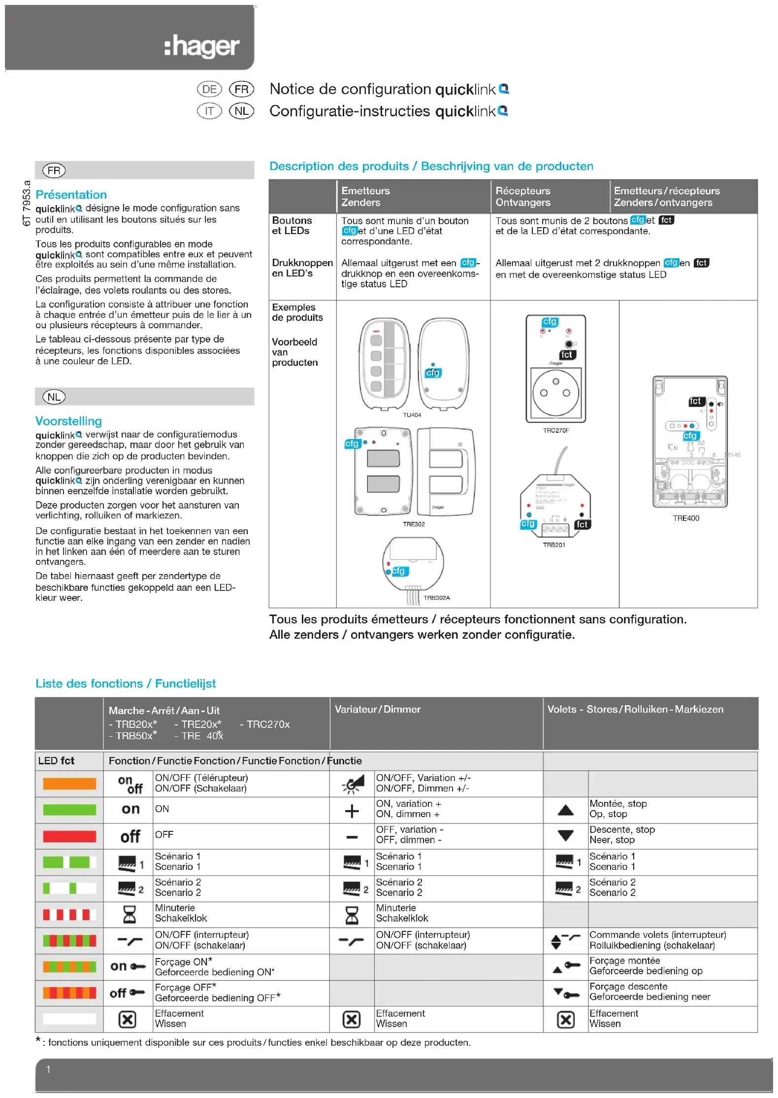 LED fctFonction / Functie Fonction / Functie Fonction / FunctieON/OFF (Télérupteur)ON/OFF (Schakelaar)ON/OFF, Variation +/-ON/OFF, Dimmen +/- ON, variation +ON, dimmen +Montée, stopOp, stop OFF OFF, variation -OFF, dimmen -Descente, stopNeer, stopScénario 1Scenario 1Scénario 1Scenario 1Scénario 1 Scenario 1Scénario 2Scenario 2Scénario 2Scenario 2Scénario 2Scenario 2MinuterieSchakelklokMinuterieSchakelklokON/OFF (interrupteur)ON/OFF (schakelaar)ON/OFF (interrupteur)ON/OFF (schakelaar)Commande volets (interrupteur)Rolluikbediening (schakelaar)Forçage ON Geforceerde bediening ON*Forçage montéeGeforceerde bediening opForçage OFF Geforceerde bediening OFF Forçage descenteGeforceerde bediening neerEffacementWissenEffacementWissenEffacementWissen Présentation désigne le mode configuration sansoutil en utilisant les boutons situés sur les produits. Tous les produits configurables en modesont compatibles entre eux et peuventêtre exploités au sein d’une même installation. Ces produits permettent la commande de l’éclairage, des volets roulants ou des stores.La configuration consiste à attribuer une fonctionà chaque entrée d’un émetteur puis de le lier à unou plusieurs récepteurs à commander. Le tableau ci-dessous présente par type derécepteurs, les fonctions disponibles associées à une couleur de LED. quicklink quicklink