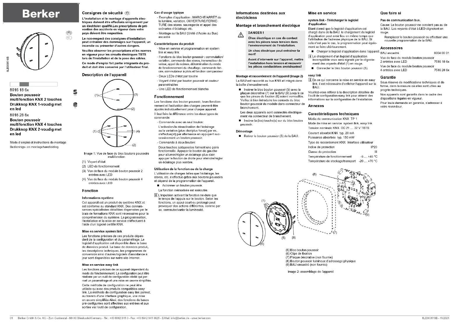 6LE000518B Consignes de sécurité a L‘installation et le montage d‘appareils élec- triques doivent être eectués uniquement par un électricien qualié.Les prescriptions de pré- vention des accidents en vigueur dans votre pays doivent être respectées. Le non-respect des consignes d‘installation peut entraîner des dommages sur l‘appareil, un incendie ou présenter d‘autres dangers. Veuillez observer les prescriptions et les normes en vigueur pour les circuits électriques TBTS lors de l‘installation et de la pose des câbles. Ce mode d‘emploi fait partie intégrante du pro- duit et doit être conservé par l‘utilisateur nal. Description de l‘appareil (1) (2) (3) (1) (2) (4) Image 1: Vue de face du bloc boutons poussoirs multifonction (1) Voyant d‘état (2) LED de fonctionnement (3) Vue de face du module bouton poussoir 2 entrées avec LED (4) Vue de face du module bouton poussoir 4 entrées avec LED Fonction Informations système Cet appareil est un produit du système KNX et est conforme au standard KNX. Des connais- sances spécialisées détaillées dispensées par le biais de formations KNX sont nécessaires pour la compréhension du système. La programmation, l‘installation et la mise en service s‘eectuent à l‘aide d‘un logiciel certié KNX. Mise en service system link Les fonctions précises de ces produits dépen- dent de la conguration et du paramétrage. Le logiciel d‘application est disponible dans la base de données produit. La base de données produit, les descriptions techniques, les programmes de conversion ainsi d‘autres logiciels d‘assistance à jour sont disponibles sur notre site Internet. Mise en service easy link Les fonctions précises de ce appareil dépendent du mode de fonctionnement. La conguration peut être réalisée par un outil de conguration dédié qui per- met un paramétrage et une mise en œuvre simpliés. Cette méthode de conguration ne peut être utilisée qu‘avec des produits compatibles easy link. La méthode de conguration easy link permet, au travers d‘une interface graphique, une mise en œuvre simpliée Ainsi, des fonctions de bases pré-congurées sont aectées aux entrées et aux sorties via l‘outil de conguration. Cas d‘usage typique - Exemples d’application ; MARCHE/ARRÊT de la lumière, variation, OUVERTURE/FERME- TURE des stores, sauvegarde et appel des scénarios d‘éclairage etc. - Montage sur la BAU (Unité d‘Accès au Bus) encastré Caractéristiques du produit - Mise en service et programmation en system link et easy link - Fonctions du bloc bouton poussoir : commutation/ variation, commande des stores, transmetteur de valeur, appel de scènes, détermination du mode de fonctionnement du chauage, commande for- cée, commutateur à plots et fonction comparateur - Deux LEDs d‘état par touche - Voyant d‘état par bouton poussoir et couleur paramétrables - Une LED de fonctionnement blanche Fonctionnement Les fonctions des bouton poussoir, leurs fonction- nement et l‘activation des charges peuvent être ajustés individuellement pour chaque appareil. Il faut faire la diérence entre les deux types de commande: - Commande avec un seul bouton: L‘activation/la désactivation de l‘éclairage ou la variation (plus clair/plus foncé) par ex. s‘eectue(nt) par alternance en appuyant suc- cessivement un bouton poussoir. - Commande à deux bouton: Deux touches juxtaposées forment une paire fonctionnelle. Appuyer le bouton de gauche pour allumer/régler un éclairage plus clair; appuyer le bouton de droite pour éteindre/régler un éclairage plus sombre. Utilisation de la fonction ou de la charge L‘utilisation de charges telles que l‘éclairage, les stores, etc. s‘eectue grâce aux boutons poussoirs et dépend de la programmation de l‘appareil. Actionner un bouton poussoir. La fonction mémorisée est exécutée. L‘impulsion activant la fonction ne dure que le temps de l‘appuis sur le bouton. Selon les fonctions, un appui court ou prolongé peut provoquer des actions diérentes, comme par ex. commuter/varier la luminosité. Informations destinées aux électriciens Montage et branchement électrique DANGER ! Choc électrique en cas de contact avec les pièces sous tension dans l‘environnement de l‘installation. Un choc électrique peut entraîner la mort! Avant d'intervenir sur l'appareil, mettre l'installation hors tension et recouvrir les pièces conductrices avoisinantes!