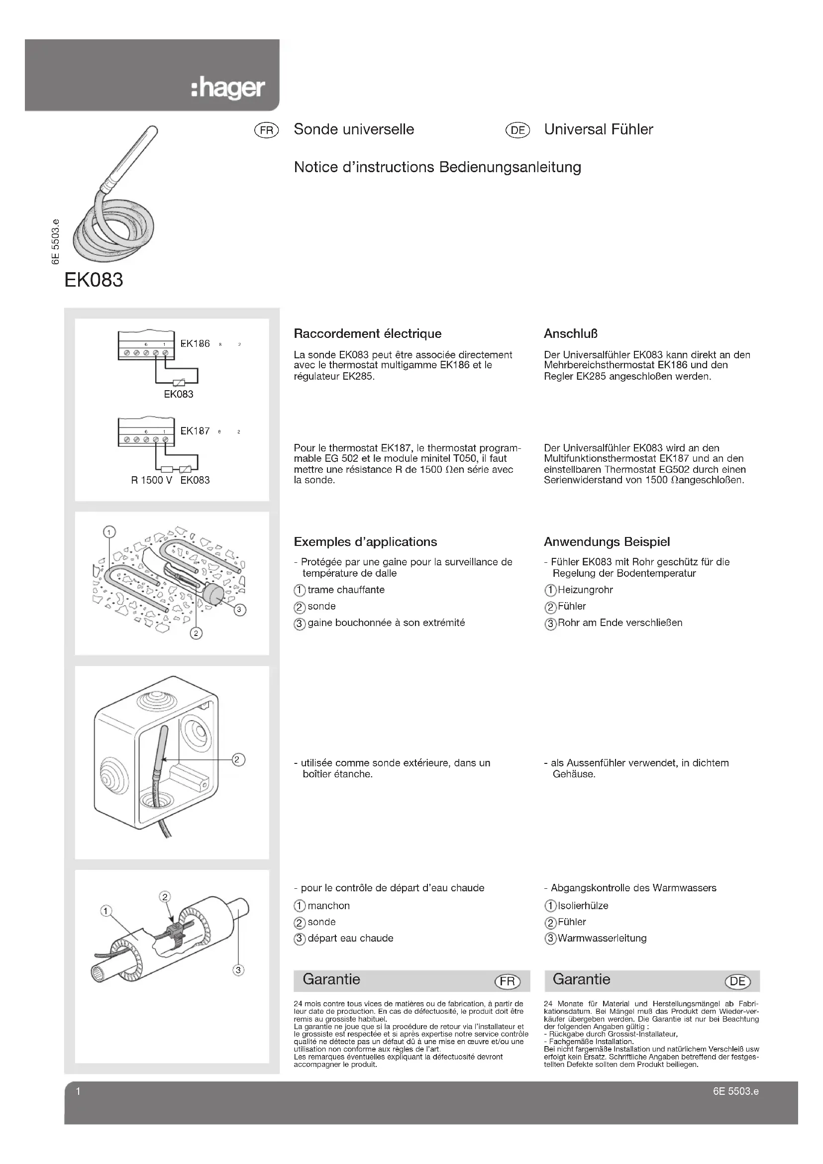 Raccordement électrique La sonde EK083 peut être associée directementavec le thermostat multigamme EK186 et lerégulateur EK285. Exemples d’applications - Protégée par une gaine pour la surveillance detempérature de dalle- utilisée comme sonde extérieure, dans un boîtier étanche.Pour le thermostat EK187, le thermostat program-mable EG 502 et le module minitel T050, il fautmettre une résistance R de 1500 Ω en série avec la sonde. trame chauffantesondegaine bouchonnée à son extrémité