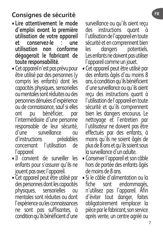 FR Consignes de sécurité • Lire attentivement le mode surveillance ou qu’ils aient reçu d’emploi avant la première des instructions quant à utilisation de votre appareil l’utilisation de l’appareil en toute et conservez-le : une sécurité et en comprennent bien dangers potentiels. utilisation non conforme les dégagerait le fabricant de Les enfants ne doivent pas utiliser l'appareil comme un jouet. toute responsabilité. • Cet appareil n’est pas prévu pour • Cet appareil peut être utilisé par être utilisé par des personnes (y des enfants âgés d'au moins 8 compris les enfants) dont les ans, à condition qu'ils bénéficient capacités physiques, sensorielles d'une surveillance ou qu'ils aient ou mentales sont réduites ou des reçu des instructions quant à personnes dénuées d’expérience l'utilisation de l'appareil en toute ou de connaissance, sauf si elles sécurité et qu'ils comprennent ont pu bénéficier, par bien les dangers encourus. Le l’intermédiaire d’une personne nettoyage et l'entretien par responsable de leur sécurité, l'utilisateur ne doivent pas être d’une surveillance ou effectués par des enfants, à d’instructions préalables moins qu'ils ne soient âgés de concernant l’utilisation de plus de 8 ans et qu'ils soient sous la surveillance d'un adulte. l’appareil. • Il convient de surveiller les • Conserver l'appareil et son câble enfants pour s’assurer qu’ils ne hors de portée des enfants âgés de moins de 8 ans. jouent pas avec l’appareil. • Cet appareil peut être utilisé par • Si le câble d’alimentation ou la des personnes dont les capacités fiche sont endommagés, physiques, sensorielles ou n’utilisez pas l’appareil. Afin mentales sont réduites ou dont d’éviter tout danger, faites l’expérience ou les connaissances obligatoirement remplacer la ne sont pas suffisantes, à pièce par le fabricant, son service condition qu’ils bénéficient d’une après vente, un centre agréé ou 7