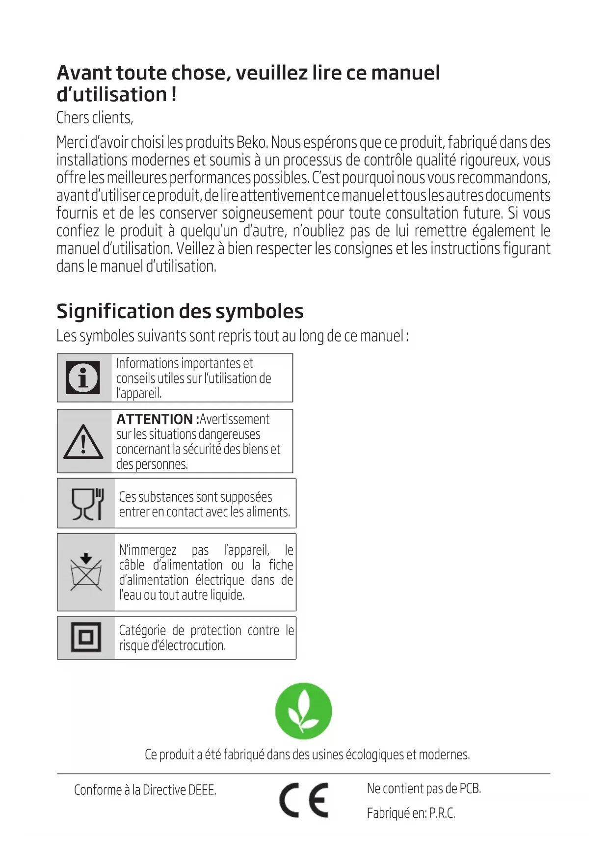 - Pendant la manipulation et le transport, portez toujours l’appareil dans son emballage d’origine. L’emballage de l’appareil le protège des dommages physiques. • Ne placez pas de charge lourde sur l’appareil ou sur l’emballage. Cela pourrait l’endommager. • Toute chute de l’appareil peut le rendre non opérationnel ou l’endommager de façon permanente.Lütfen önce bu kılavuzu okuyun! Değerl Müştermz, Beko ürününü terch ettğnz çn teşekkür ederz. Yüksek kalte ve teknoloj le üretlmş olan ürününüzün sze en y verm sunmasını styoruz. Bunun çn, bu kılavuzun tamamını ve verlen dğer belgeler ürünü kullanmadan önce dkkatle okuyun ve br başvuru kaynağı olarak saklayın. Ürünü başka brsne verrsenz, kullanma kılavuzunu da brlkte vern. Kullanma kılavuzunda belrtlen tüm blg ve uyarıları dkkate alarak talmatlara uyun. Sembollerin anlamları Bu kullanma kılavuzunun çeştl kısımlarında aşağıdak semboller kullanılmıştır: