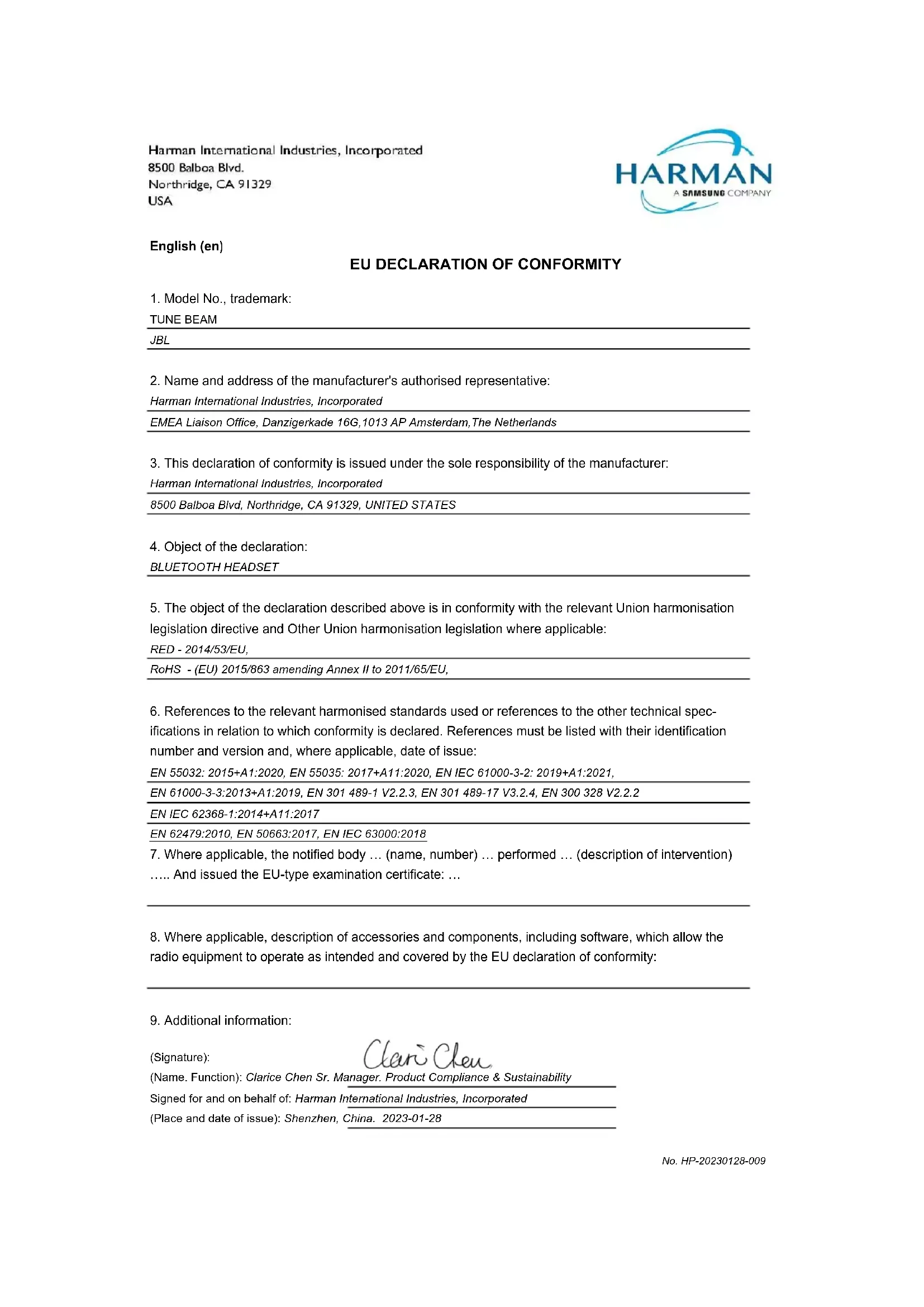 Harman International Industries, Incorporated EMEA Liaison Office, Danzigerkade 16G,1013 AP Amsterdam,The Netherlands