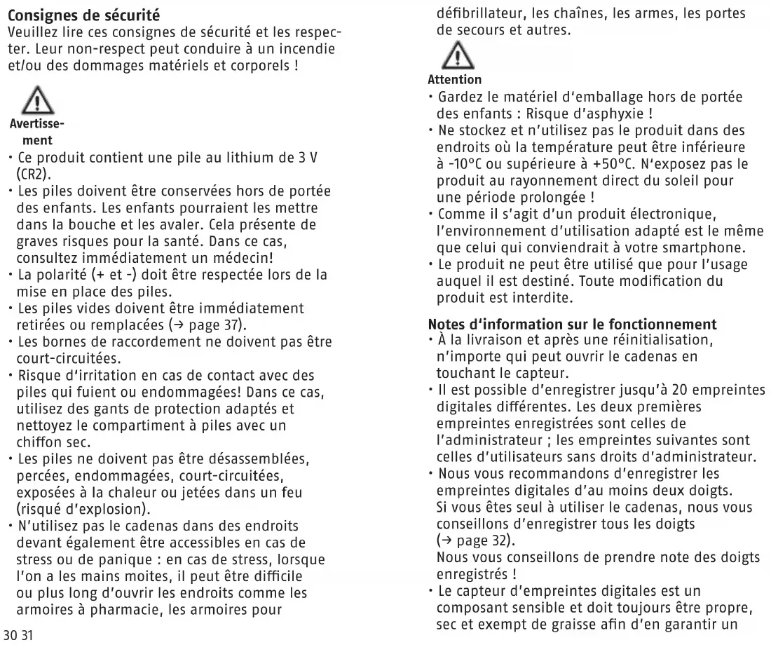 - Pour ouvrir le cadenas, il peut être nécessaire de placer le doigt plusieurs fois de suite, par exemple si le bout du doigt présente des changements par rapport à l‘apprentissage en raison de la sécheresse, de l‘humidité ou de la crème pour la peau.