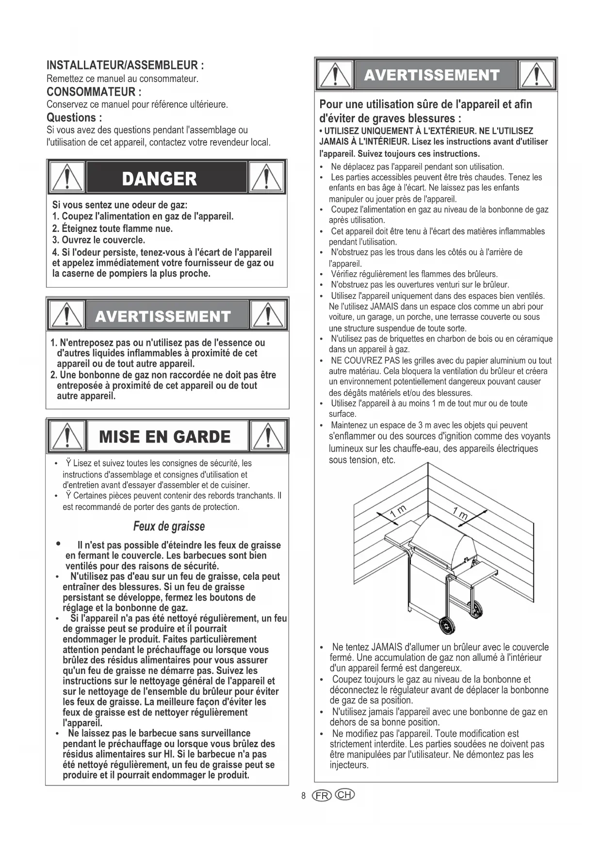 1 m 1 m CH9 Conseils de sécurité Ÿ Avant d'ouvrir la vanne du gaz, vérifiez l'étanchéité du régulateur. Ÿ Lorsque l'appareil n'est pas en cours d'utilisation, fermez tous les boutons de réglage ainsi que le gaz. Ÿ Utilisez des ustensiles à long manche et des gants de cuisine pour éviter les brûlures et les éclaboussures. Utilisez des gants de protection lorsque vous manipulez des composants chauds. Ÿ La charge maximale pour la plaque chauffante (si l'appareil en est équipé) et le plateau latéral est de 4,5 kg. Diamètre minimum de 200 mm et diamètre maximum de 260 mm pour le récipient de cuisson. REMARQUE : Votre barbecue peut ne PAS être équipé d'une plaque chauffante! Ÿ Le récipient à graisse (si équipé) doit être inséré dans l'appareil et vidé après chaque utilisation. Ne retirez pas le récipient à graisse tant que l'appareil n'a pas complètement refroidi. Ÿ Soyez très prudent lorsque vous ouvrez le couvercle, puisque de la vapeur chaude peut s'échapper. Ÿ Soyez très prudent lorsque des enfants, des personnes âgées ou des animaux domestiques sont à proximité. Ÿ Si vous remarquez de la graisse ou toute autre matière chaude qui coule sur la vanne, le tuyau ou le régulateur, coupez toute l'alimentation en gaz. Déterminez la cause, corrigez-la, puis nettoyez et vérifiez la soupape, le tuyau et le régulateur avant de continuer. Effectuez un test d'étanchéité. Ÿ N'entreposez pas d'objets ou de matériaux à l'intérieur du chariot de l'appareil qui pourraient bloquer la circulation de l'air de combustion vers le dessous du panneau de commande ou de la chambre de combustion. Ÿ NE déconnectez ou NE changez PAS la bonbonne de gaz à moins de 3 m d'une flamme nue ou de toute autre source d'ignition AVERTISSEMENT Fermez les boutons de réglage et la bonbonne de gaz lorsque vous n'utilisez pas l'appareil. S'il n'y a PAS d'allumage dans les 5 secondes, fermez les boutons de réglage, attendez 5 minutes et répétez la procédure. Si le brûleur ne s'allume pas avec la vanne ouverte, le gaz continuera de s'échapper du brûleur et pourrait accidentellement s'enflammer et causer des blessures.