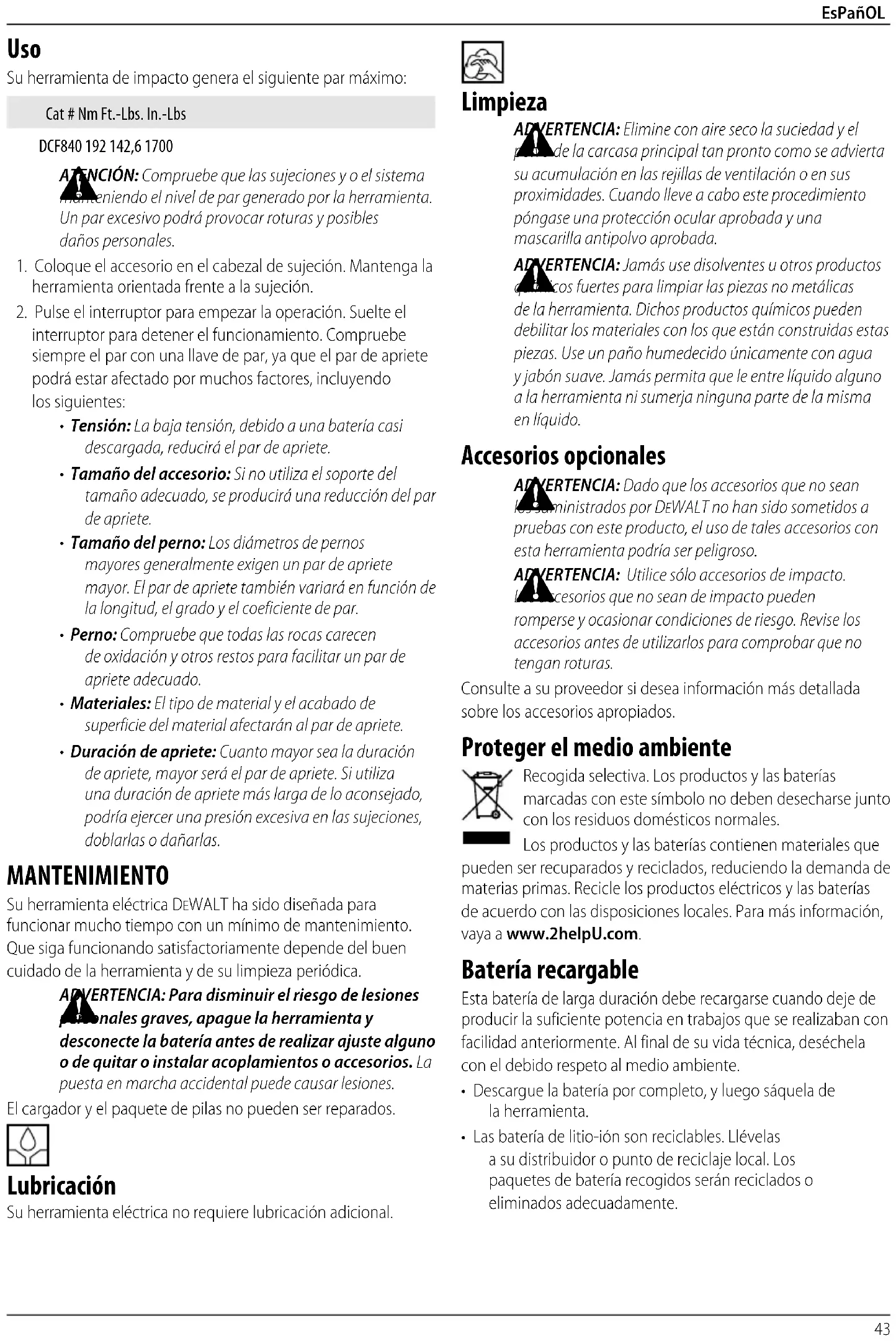 ne doit pas être tirée pour verrouiller l’accessoire. Pour retirer un accessoire, tirer la bague du mandrin vers l’avant de l’outil. Retirer l’accessoire et relâcher labague. Utilisation Votre outil à choc génère le couple maximum suivant: Cat # Nm Ft.-Lbs. In.-Lbs DCF840 192 142,6 1700