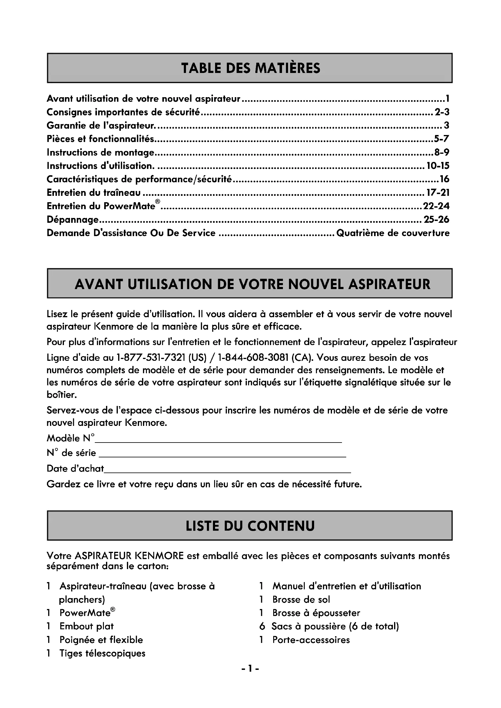1 Embout plat 1 Poignée et flexible 1 Tiges télescopiques Lisez le présent guide d’utilisation. Il vous aidera à assembler et à vous servir de votre nouvel aspirateur Kenmore de la manière la plus sûre et efficace. Pour plus d'informations sur l'entretien et le fonctionnement de l'aspirateur, appelez l'aspirateur Ligne d'aide au 1-877-531-7321 (US) / 1-844-608-3081 (CA). Vous aurez besoin de vos numéros complets de modèle et de série pour demander des renseignements. Le modèle et les numéros de série de votre aspirateur sont indiqués sur l'étiquette signalétique située sur le boîtier. Servez-vous de l’espace ci-dessous pour inscrire les numéros de modèle et de série de votre nouvel aspirateur Kenmore. Modèle N°_____________________________________________ N° de série _____________________________________________ Date d’achat_____________________________________________ Gardez ce livre et votre reçu dans un lieu sûr en cas de nécessité future.