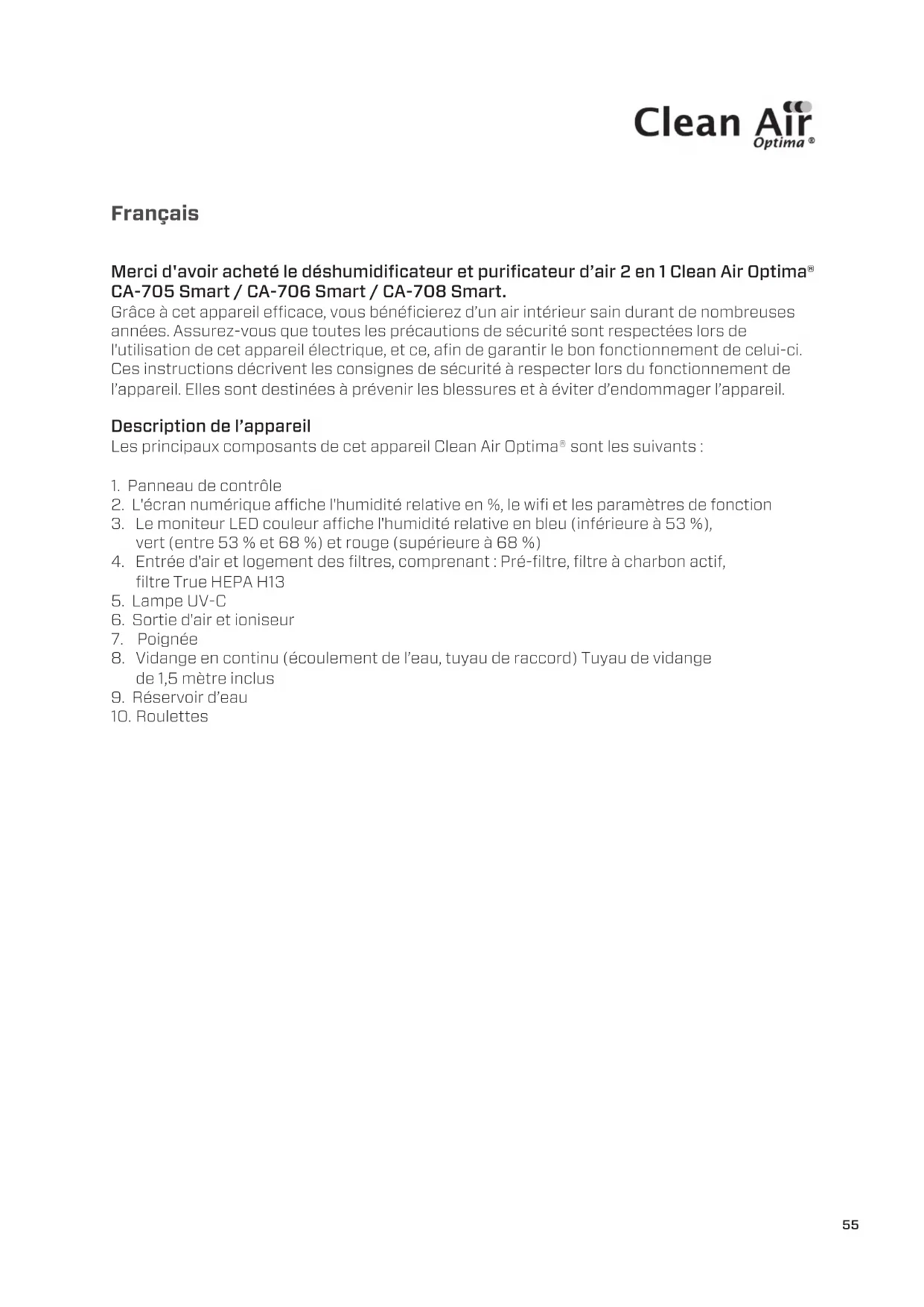 ainsi que les circonstances à l’origine de ces problèmes. Le déshumidificateur Clean Air Optima® CA-705 Smart / CA-706 Smart / CA-708 Smart est soumis à des procédures d’essai strictes avant de quitter l’usine. Si, dans un délai de deux ans à compter de la date d'achat, le produit ne fonctionne pas conformément aux spécifications en raison de défauts d'usine, l'acheteur a droit à la réparation ou au remplacement gratuit des pièces défectueuses sur simple présentation de cette garantie (à condition que le dysfonctionnement ou les dommages à l'appareil et/ou à ses éléments soient survenus dans des conditions normales de fonctionnement). Ce qui est couvert par la garantie: Toutesles pièces défectueuses, en raison d’un défaut de matériel ou de fabrication. Durée:deuxans à compter de la date d’achat. Ce que nous ferons: Réparer ou remplacer toute piècedéfectueuse. Autres conditions Les dispositions de la présente garantie remplacent toute autre garantie écrite, expresse ou implicite, écrite ou orale, y compris toute garantie de qualité marchande ou d’adaptation à un usage particulier. La responsabilité maximale du fabricant ne peut pas excéder le prix d’achat réel que vous avez payé pour le produit. En aucun cas, le fabricant ne pourra être tenu responsable de dommages spéciaux, accidentels, conséquents ou indirects. Cette garantie ne couvre pas les défaillances résultant d’une utilisation ou d’un entretien inapproprié ou déraisonnable, d’un montage incorrect, d’un accident ou de catastrophes naturelles, d’un emballage inadéquat, ou d’une falsification, altération ou modification non autorisée, tels que déterminés à notre seule discrétion. La présente garantie est nulle si l’étiquette portant le numéro de série a été retirée ou eacée.70 Merci de votre lecture! Partagez vos commentaires sur le déshumidificateur Clean Air Optima® CA-705 Smart / CA-706 Smart / CA-708 Smart sur le site : www.cleanairoptima.com Pour la foire aux questions concernant le CA-705 Smart / CA-706 Smart/ CA-708 Smart, rendez-vous sur la page www.cleanairoptima.com et recherchez le CA-705Smart / CA-706 Smart / CA-708 Smart Télécharger le mode d'emploi au format PDF sur: www.cleanairoptima.com/info/manuals Regardez toutes les vidéos des produits Clean Air Optima® sur: www.youtube.com Clean Air Optima International B.V. | David Ricardostraat 9-7 / 9-9 | 7559 SH Hengelo (ov) Pays-Bas | Téléphone: +31 (0) 74 - 2670145 Clean Air Optima Germany GmbH | Enschedestraße 14 | 48529 Nordhorn | Allemagne Téléphone: +49 (0) 5921 879-121 Courriel :info@cleanairoptima.com Internet: www.cleanairoptima.com71 Unidad principal CA-705 Smart / CA-706 Smart / CA-708 Smart72 Español Gracias por la compra del humidificador 2 en 1 de Clean Air Optima®: Deshumidificador ypurificador de aire CA-705 Smart / CA-706 Smart / CA-708 Smart. Este eficiente yeficaz producto le proporcionará muchos años de aire interior saludable. Cuando utilice este aparato eléctrico, cumpla siempre todas las medidas de seguridad para su correcto funcionamiento. En estas instrucciones se explican las medidas de seguridad que debe respetar durante su funcionamiento, las cuales han sido concebidas para evitar daños personales yal propio aparato. Descripción Este aparato de Clean Air Optima® consta de los siguientes componentes principales: