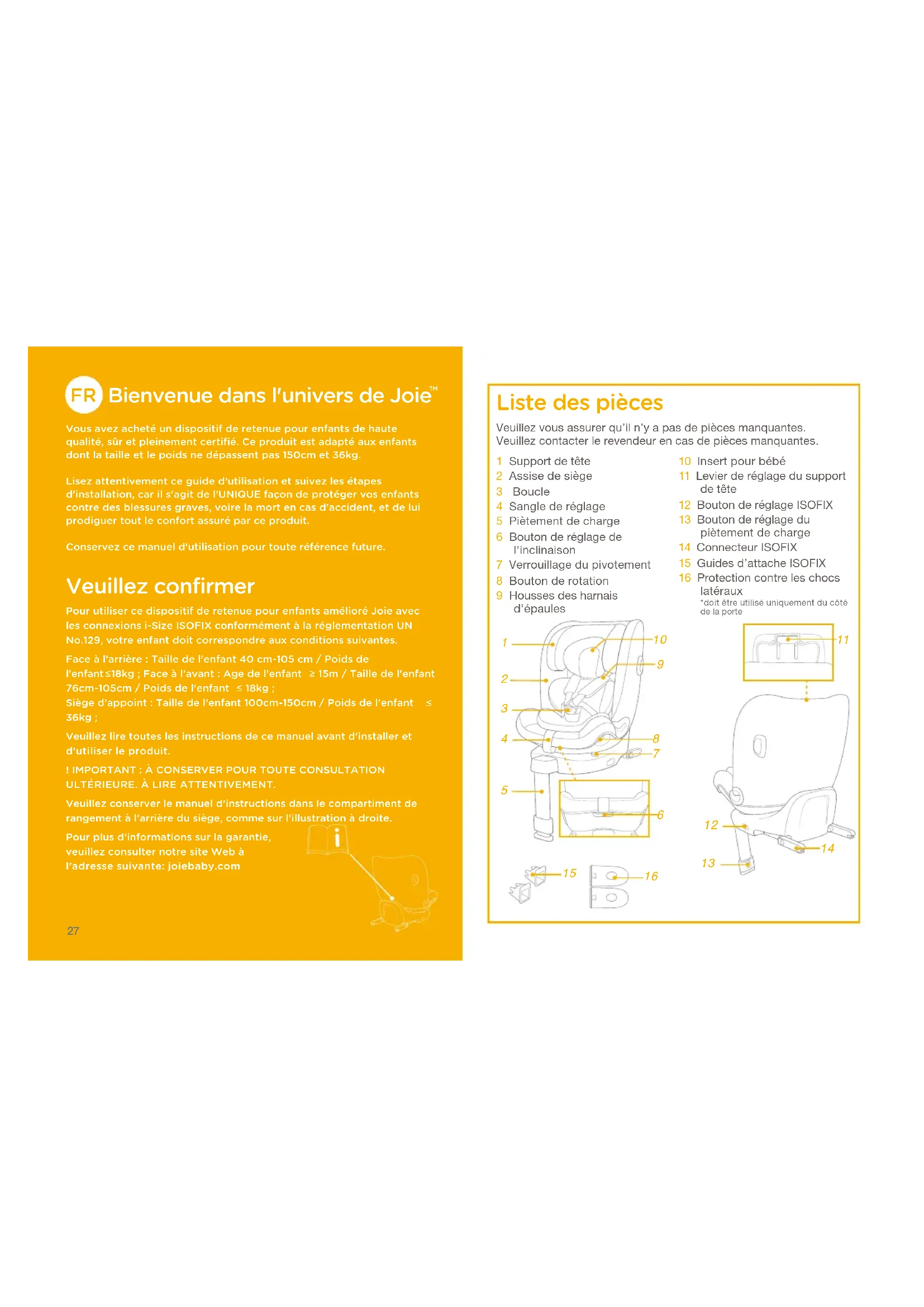 36kg ;Veuillez lire toutes les instructions de ce manuel avant d'installer et d'utiliser le produit.! IMPORTANT : À CONSERVER POUR TOUTE CONSULTATION ULTÉRIEURE. À LIRE ATTENTIVEMENT.Veuillez conserver le manuel d'instructions dans le compartiment de rangement à l'arrière du siège﹐ comme sur l'illustration à droite. Pour plus d’informations sur la garantie﹐ veuillez consulter notre site Web à l’adresse suivante: joiebaby.com Liste des pièces 1 Support de tête2 Assise de siège3 Boucle4 Sangle de réglage5 Piètement de charge6 Bouton de réglage de l'inclinaison7 Verrouillage du pivotement8 Bouton de rotation9 Housses des harnais d'épaules10 Insert pour bébé11 Levier de réglage du support de tête12 Bouton de réglage ISOFIX13 Bouton de réglage du piètement de charge14 Connecteur ISOFIX15 Guides d’attache ISOFIX16 Protection contre les chocs latéraux*doit être utilisé uniquement du côté de la porteVeuillez vous assurer qu’il n’y a pas de pièces manquantes. Veuillez contacter le revendeur en cas de pièces manquantes.