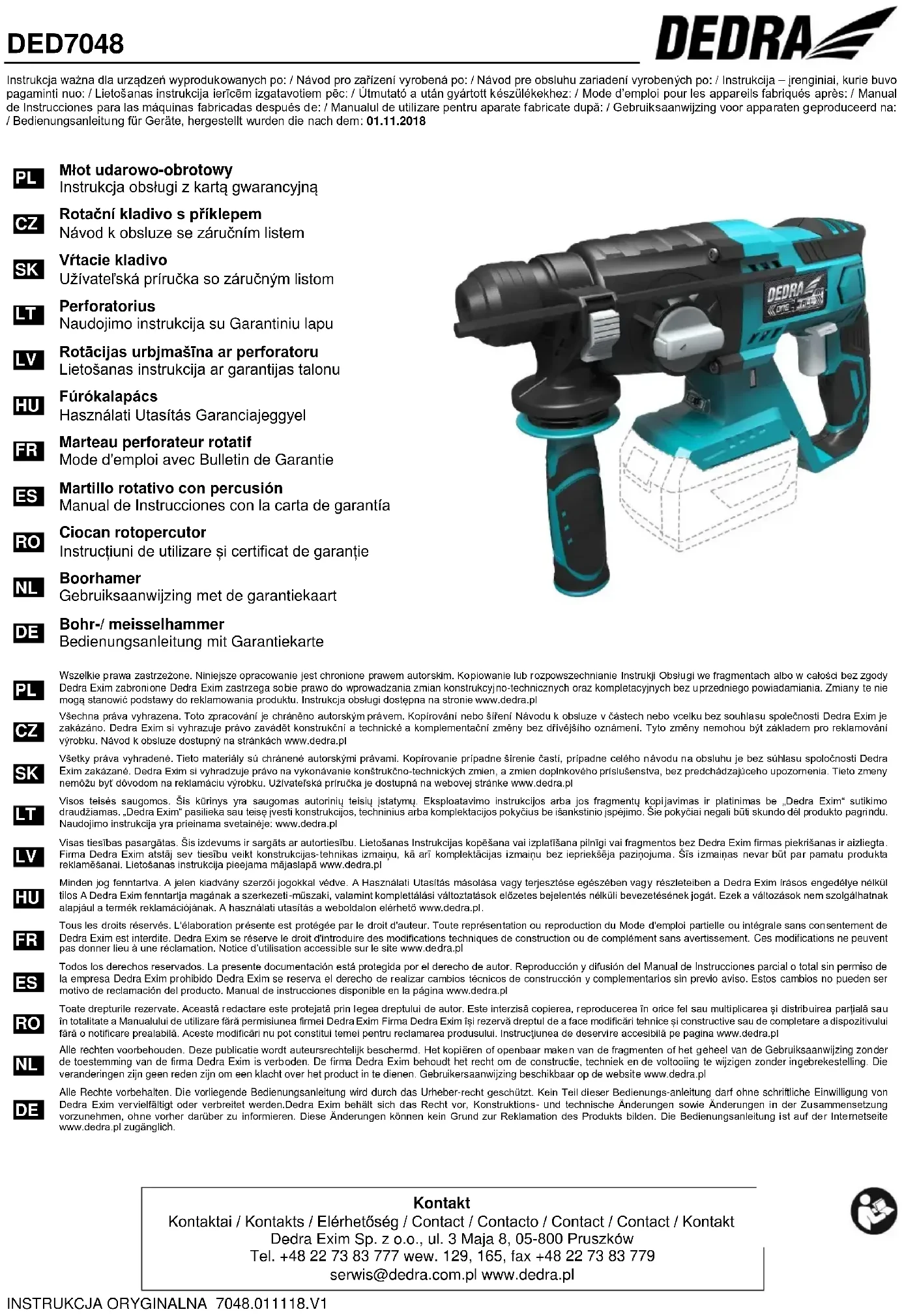 Accessoires recommandés Il est possibile de doter l’appareil électrique de ligne ONE+ALL de n’importe quel accumulateur et chargeur de la ligne ONE+ALL et chaque outil (embout de travail) du mandrin SDS Plus. Veuillez bien respecter les recommandations du fabricant des embouts de travail. Afin d’acheter les pièces de rechange et les accessoires, il faut prendre contact avec le Service Dedra-Exim. Les données de contact se trouvent à la première page du mode d’emploi. En faisant la commande des pièces, veuillez indiquer le numéro de LOT placé sur la plaque signalétique et le numéro de pièce du dessin de montage. Durant la période de garantie, les réparations sont faites selon les principes présentés dans la Carte de Garantie. Veuillez transmettre le produit au dépannage dans le lieu d’achat (le vendeur est obligé à recevoir le produit reclamé) ou l’envoyer au Service Central DEDRA-EXIM. Veuillez bien joindre la carte de garantie délivrée par l’importateur. A défaut de ce document, la réparation sera traitée d’après-vente. La période de garantie expirée, le Service Central fait les réparations. Il faut envoyer le produit endommagé au Service (les frais d’envoi chargent l’utilisateur).