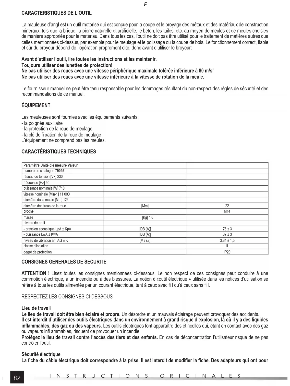 Paramètre Unité d e mesure Valeur numéro de catalogue 79095 réseau de tension [V~] 230 fréquence [Hz] 50 puissance nominale [W] 710 vitesse nominale [Min-1] 11 000 diamètre de la meule [Mm] 125 diamètre des trous de la roue [Mm] 22 broche M14 masse [Kg] 1,6 niveau de bruit - pression acoustique LpA ± KpA [DB (A)] 78 ± 3 - puissance LwA ± KwA [DB (A)] 89 ± 3 niveau de vibration ah, AG ± K [M / s2] 3,84 ± 1,5 classe d’isolation II degré de protection IP20