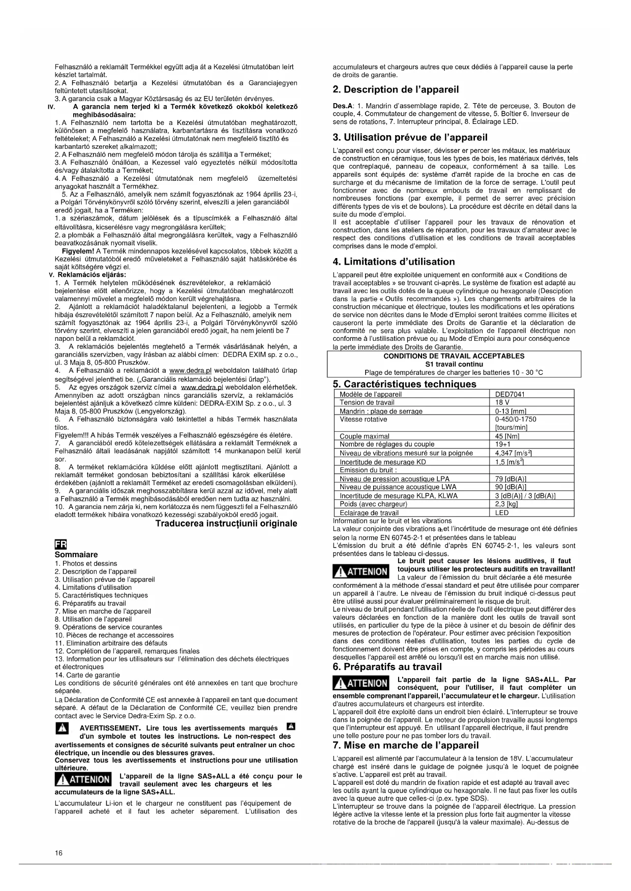 Accessoires recommandés Il est possibile de doter la visseuse-perceuse de ligne SAS+ALL de n’importe quel accumulateur et chargeur de la ligne SAS+ALL et également de chaque outil (embout de travail) avec la queue cylindrique ou hexagonale adapté au travail avec tous les forets communément disponibles, d’amateur et professionnels (pour percer le bois, le béton et les métaux), avec les embouts à percer, avec différents types d’ajoutages etc. Veuillez bien respecter les recommandations du fabricant. Afin d’acheter les pièces de rechange et les accessoires, il faut prendre contact avec le Service Dedra-Exim. Les données de contact se trouvent à la première page du mode d’emploi. En faisant la commande des pièces, veuillez indiquer le numéro de LOT placé sur la plaque signalétique et le numéro de pièce du dessin de montage. Durant la période de garantie, les réparations sont faites selon les principes présentés dans la Carte de Garantie. Veuillez transmettre le produit au dépannage dans le lieu d’achat (le vendeur est obligé à recevoir le produit reclamé) ou l’envoyer au Service Central DEDRA-EXIM. Veuillez bien joindre la carte de garantie délivrée par l’importateur. A défaut de ce document, la réparation sera traitée d’après-vente. La période de garantie expirée, le Service Central fait les réparations. Il faut envoyer le produit endommagé au Service (les frais d’envoi chargent l’utilisateur).